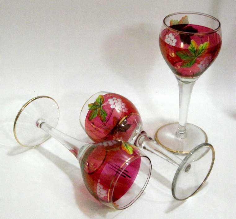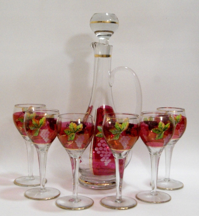 Красивый графин + 6 стаканов, выполнен из бесцветного хрустального стекла. Цельная пробка, с вырезанным виноградным узором. Набор изготовлен вручную, есть небольшие различия в размерах очков. На одном стакане позолота по краю нанесена слишком высоко и фрагментарно. на изделии нет потертостей позолоты, нет царапин и дефектов, выглядит неиспользованным или использованным эпизодически.
