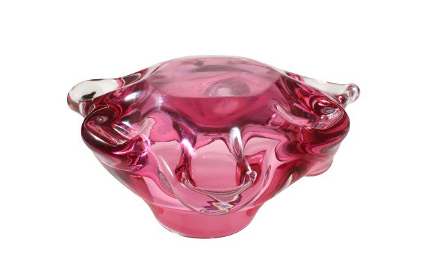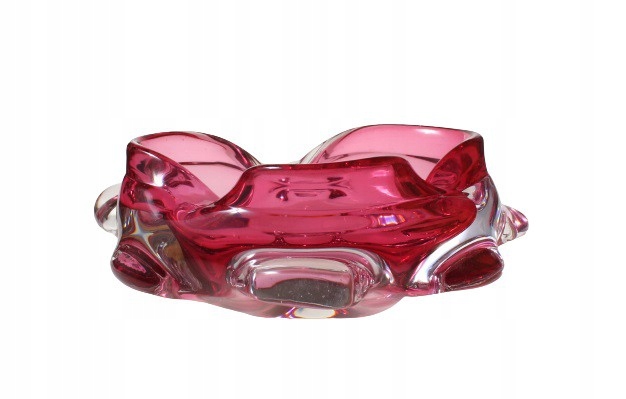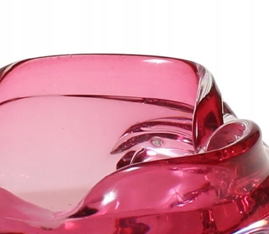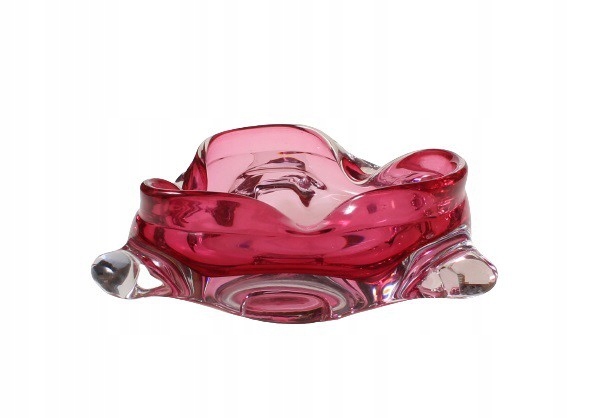 Пепельница на три сигареты из двухслойного содового стекла ручной формовки: снаружи бесцветная, внутри окрашенная в розовый цвет. Пепельница родом из Чехословакии. 2-я половина 20 век