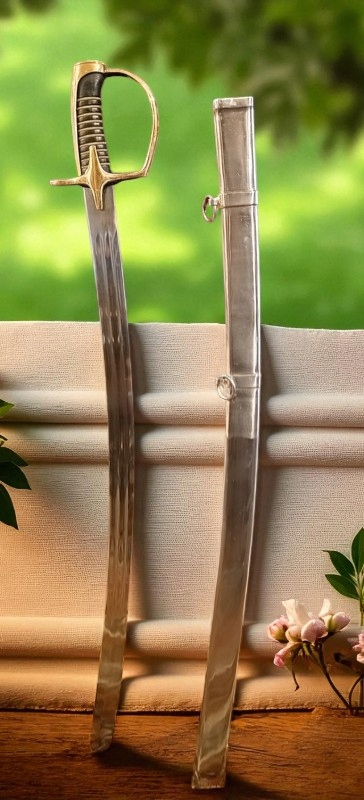 Современное, очень эстетично выполненное изделие, созданное по образцу оригинальных экспонатов. Предназначен для украшения. Сабля изготовлена из обычной полированной стали. Использованные материалы: полированная сталь, кожа, латунь.