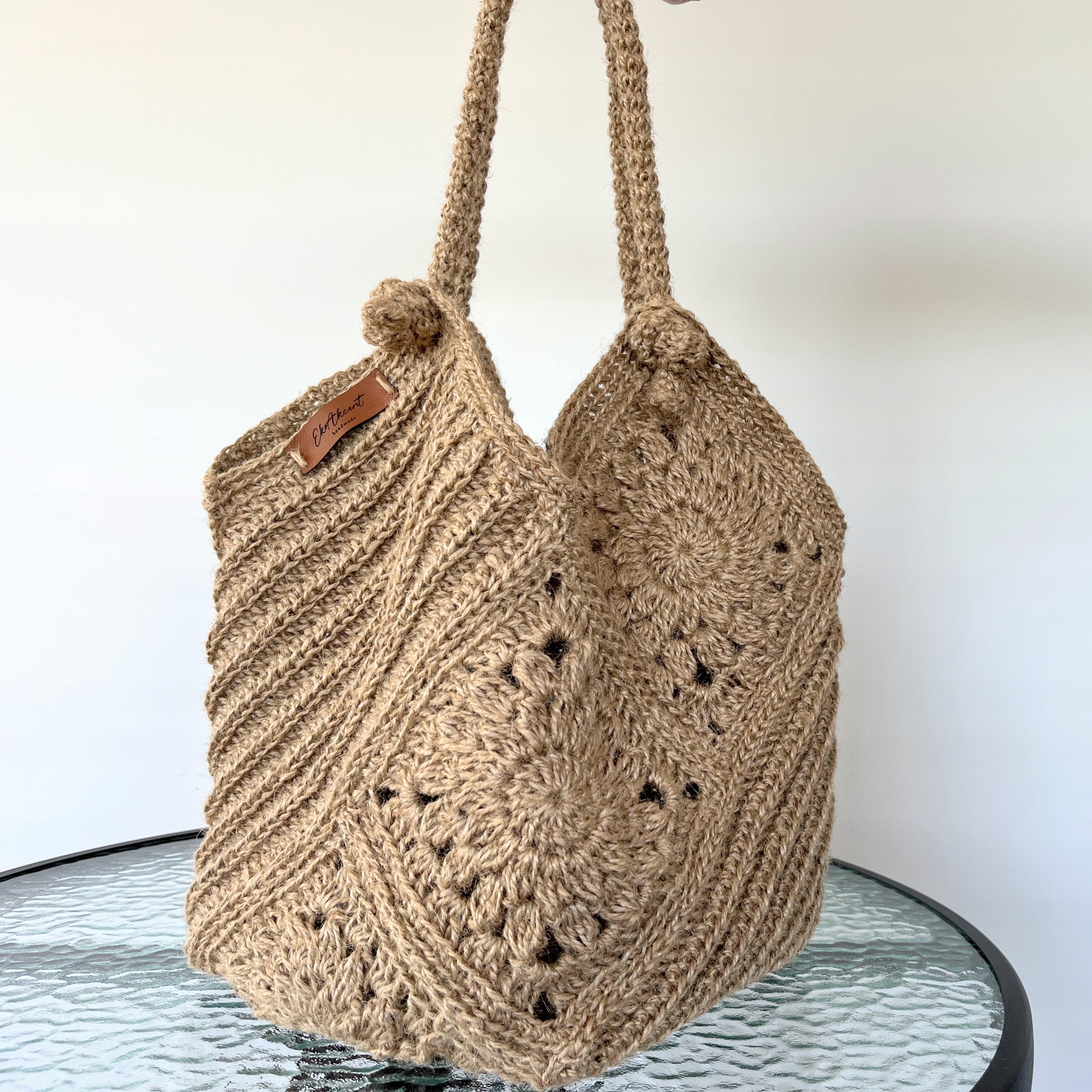 Boho Bloom Tote – джутовая сумка в стиле бохо, связанная вручную крючком.