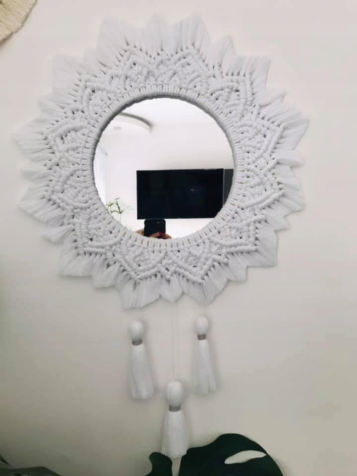 Сочетание зеркала и макраме — идеальный комплект. Красивое украшение в стиле бохо. Общий диаметр 35-40см. Цвет нити — экрю/натуральный или белый. Зеркало небьющееся, безопасное и поэтому очень легкое. Цена указана за 1 шт. После покупки сообщите, пожалуйста, какого цвета шнурок. Также доступны другие цвета.