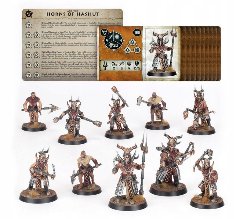 Из этого пластикового набора, состоящего из нескольких частей, можно собрать полный отряд Рогов Хашута для использования в играх Warcry. Эти ревностные работорговцы, возглавляемые военачальниками Руинаторов, надевают для боя рабочую кожу, цепи и чешуйчатые доспехи. В то время как элиты носят медные боевые маски и владеют разнообразными цепами, рогатыми двузубцами, пепельными бомбами и огнеметающими устройствами, меньшие Разрушители банды вооружены такими орудиями труда, как молотки и мотыги. Эти модели также можно использовать как часть армии Рабов Тьмы в играх Warhammer Age of Sigmar.