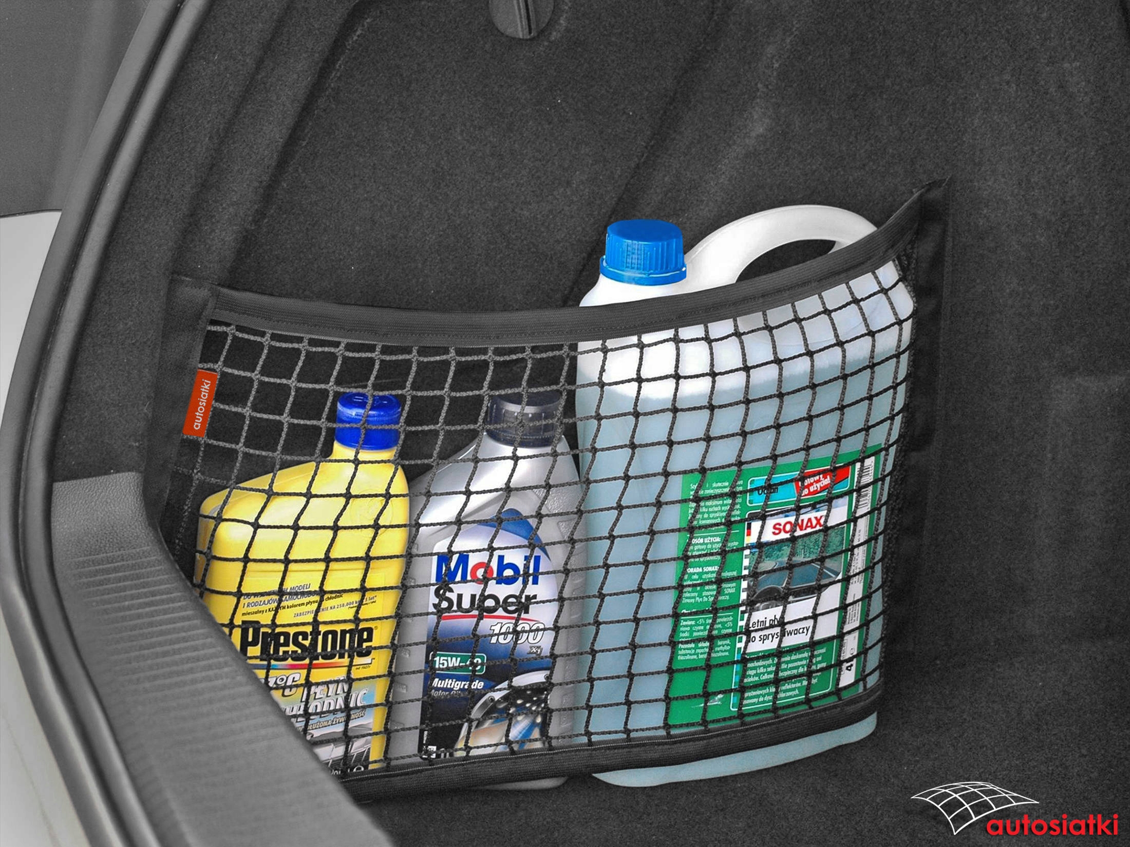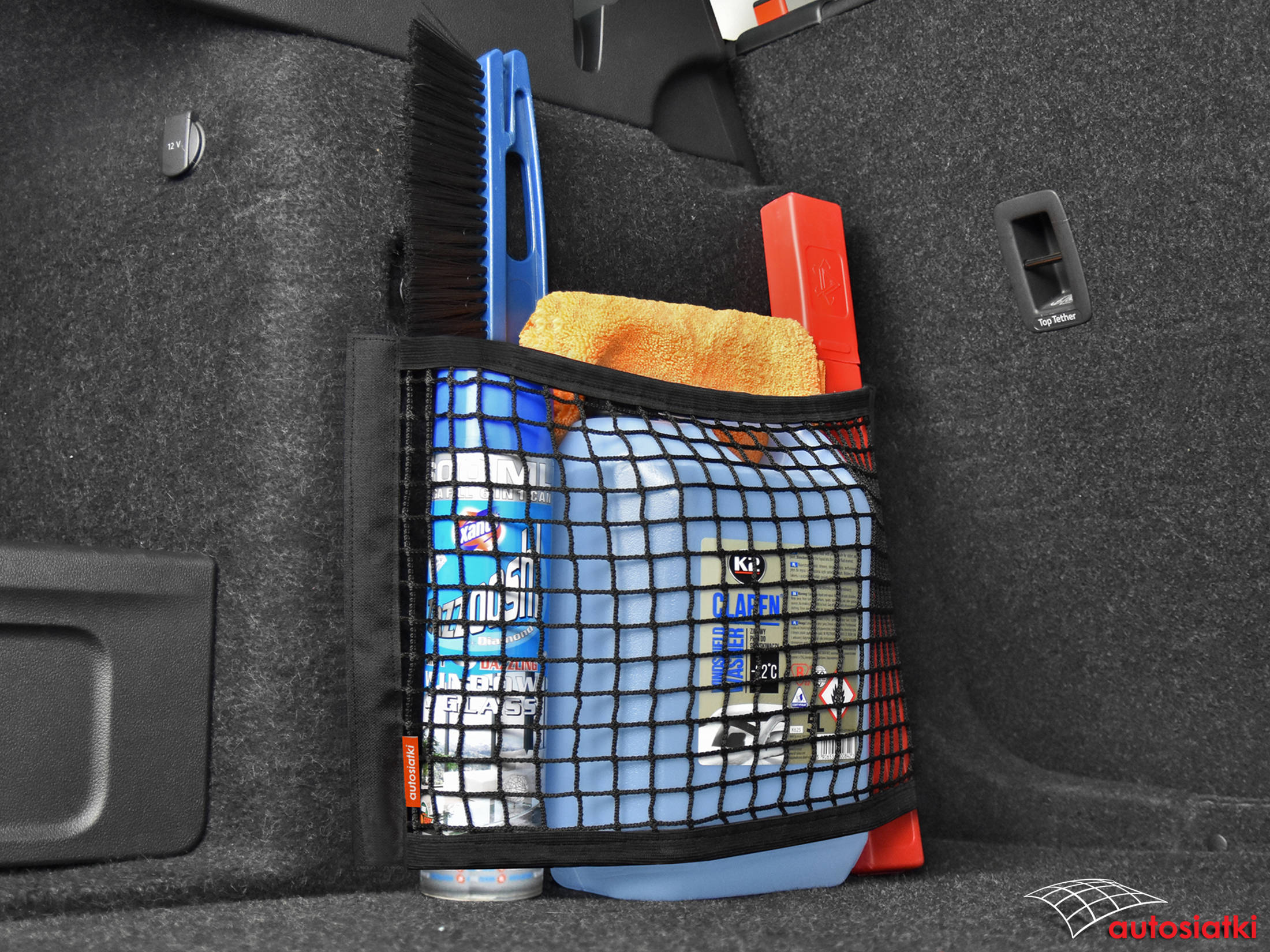 Это прочная сетка с лентой-липучкой по бокам. Отделка гибкой резиной сверху и снизу, что позволяет подогнать сетку под транспортируемые предметы. Ограждение крепится к ковру в багажнике или салоне автомобиля.