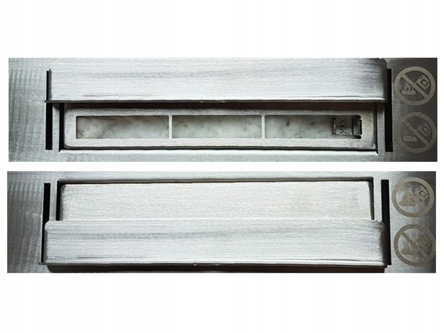 Передняя кромка (B) биокамина приподнята, благодаря чему используемые аксессуары (например, камни из набора или другие, купленные на наших аукционах Аллегро и ароматизатор) будут не выпадать во время использования, например, из огнетушителя.