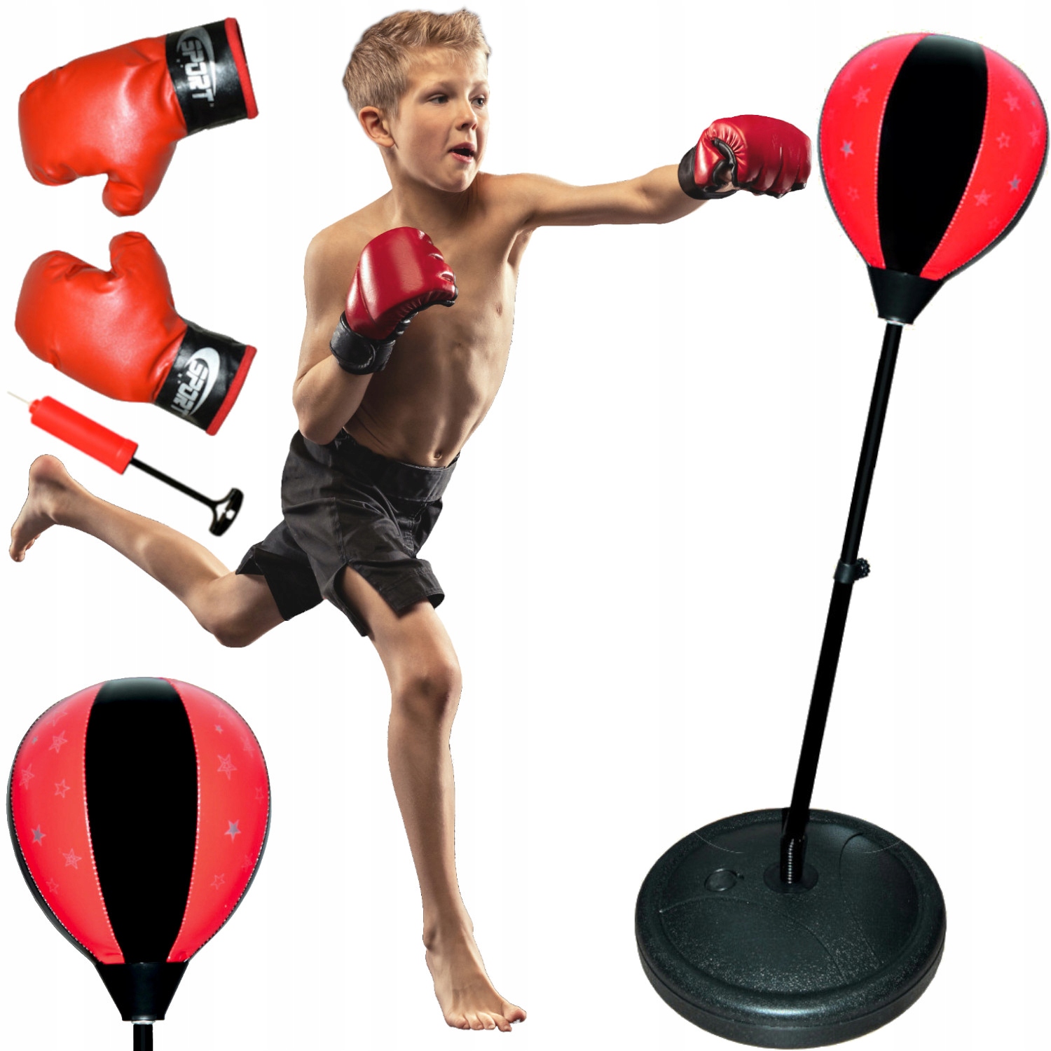 Упражнения с этим набором развивают координацию движений, ловкость и рефлексы. Ребенок высвобождает эмоции безопасным способом, улучшая при этом работоспособность организма. Груша специально профилирована и имеет форму профессиональной боксерской груши. Прочное основание, которое одновременно является нагрузкой, удерживает грушу на месте даже при сильных ударах. Благодаря регулировке высоты мы можем подогнать комплект под рост ребенка.