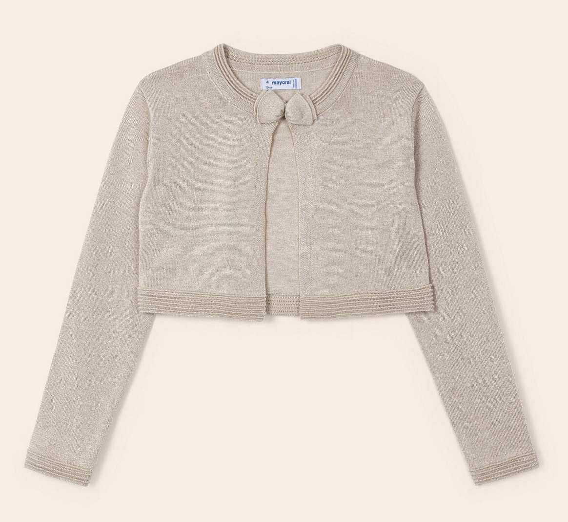 Свитер-болеро с длинными рукавами для девочек. Гибкий, эластичный и приятный на ощупь трикотаж с добавлением блестящей золотой нити. Круглый вырез. Застежка на одну пуговицу. Декоративный бантик на шее. Длина до бедра.