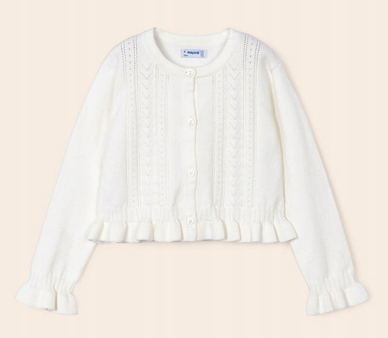 Свитер-болеро с длинными рукавами для девочки. Круглый вырез. Застегивается на пуговицы спереди. Ажурные узоры. Рукава отделаны рюшами. Длина бедра. Гибкая, эластичная и приятная на ощупь ткань.