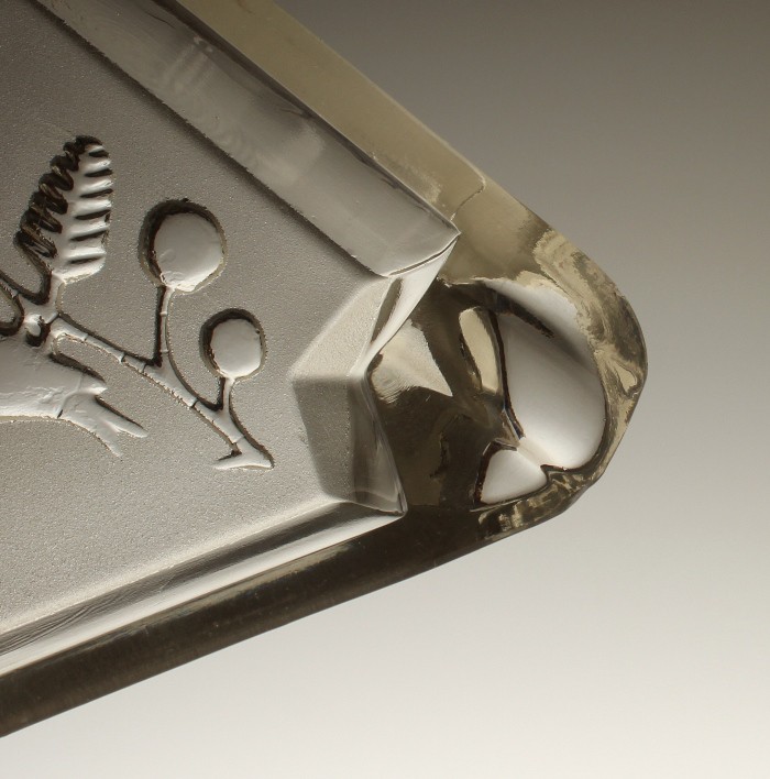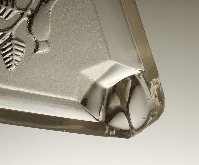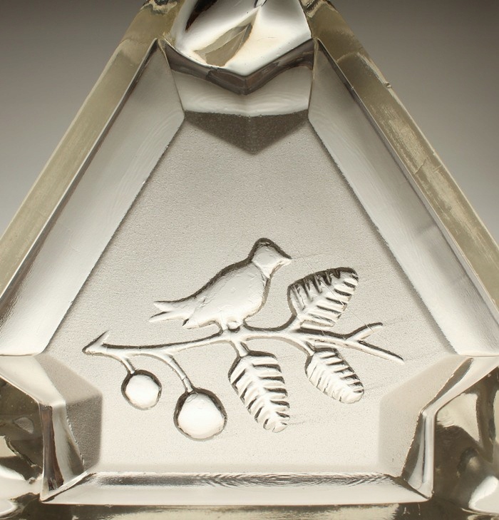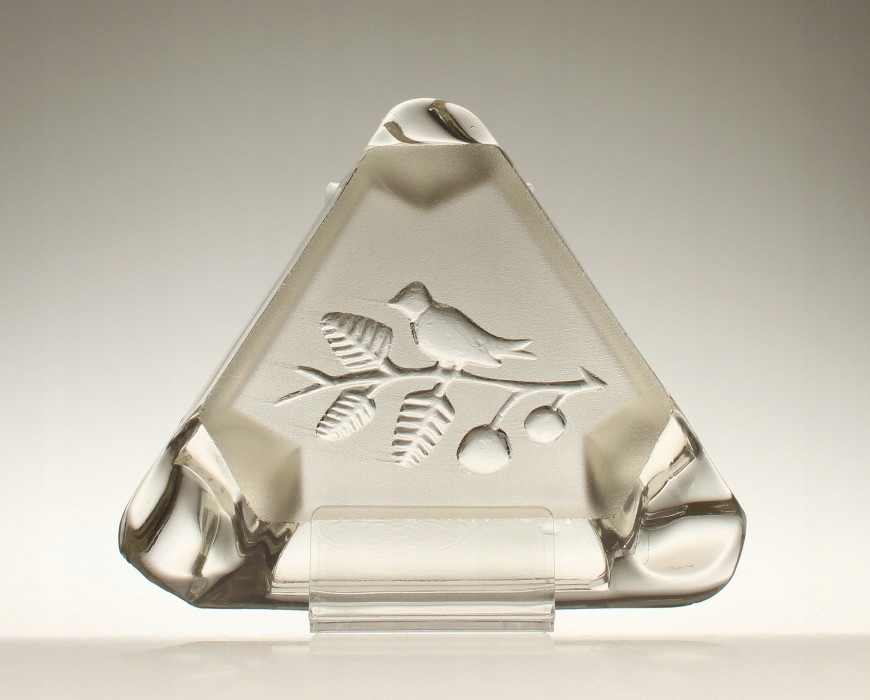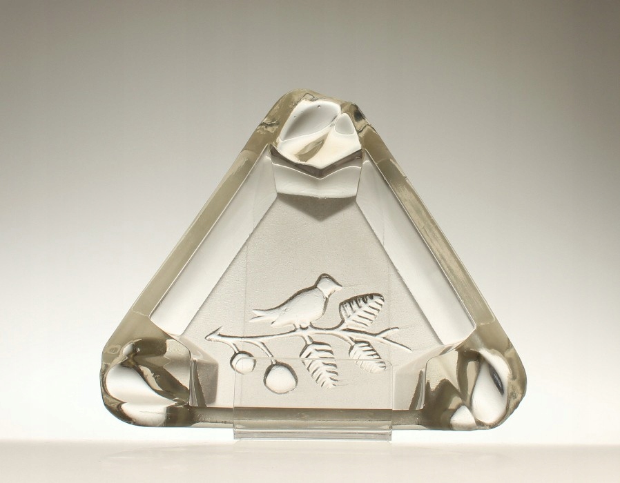 Треугольная пепельница из бесцветного прессованного стекла. Выполнена в стиле арт-деко. Матовая основа, украшенная тиснением птички на веточке. Пепельница произведена на Стекольно-хрустальном заводе имени Болеслава Моравского в Радомско. Каталожный номер 134. 1940-е/1950-е годы