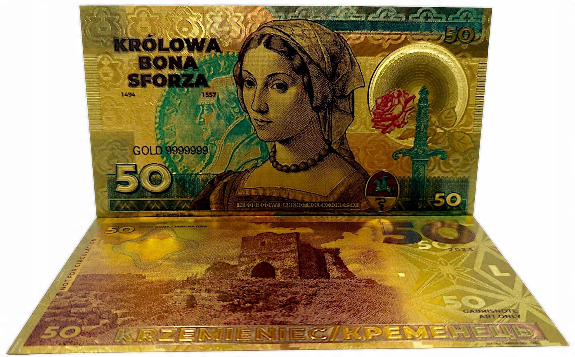 Позолоченная банкнота с изображением королевы Боны Сфорца – настоящая жемчужина. для каждого коллекционера и любителя истории! Он не только впечатляет своим уникальным дизайном и точностью исполнения, но и отдает дань уважения одной из самых важных фигур в польской истории. Королева Бона была символом ума, силы и дальновидности, и иметь такую банкноту — это не только инвестиция в красоту, но и в культурное наследие. Идеально подходит в качестве роскошного подарка, сочетающего в себе элегантность и историческую значимость. Не упустите возможность пополнить свою коллекцию этой уникальной и неповторимой вещью!