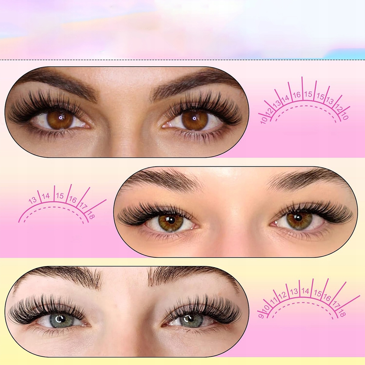 В наличии длина от 10 до 16 мм, что позволяет свободно подстраивать ресницы под индивидуальные предпочтения и случаи, создавая неповторимый макияж.