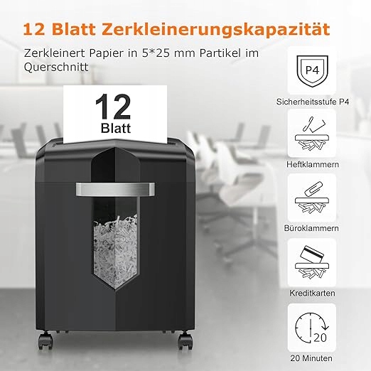 - Уничтожение до 12 листов за раз — идеальное решение для интенсивного офисного использования.