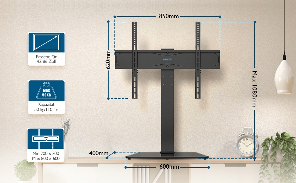 Подставка идеально подходит для телевизоров с диагональю 42–86 дюймов, максимальной нагрузкой 50 кг и совместима с размерами VESA от 200 x 200 мм до 800 x 600 мм. Максимальную высоту подставки под телевизор можно увеличить до 1080 мм. Длина пластины этой подставки для телевизора составляет 850 мм, а длина кронштейнов — 620 мм.