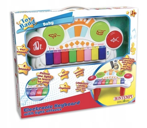 Детское электронное пианино с ногами итальянской компании Bontempi. Набор позволяет вам научиться играть через свет, которые показывают ребенка, который нажимает клавишу. Подключившись к игроку, вы можете сыграть другие мелодии по вашему выбору, благодаря тому, что пианино будет отличным инструментом, который позволяет вам повторять уроки музыки. 6 звуков, 4 ритма с расположением, 15 ранее записанных мелодий, 7 звуков автомобиля и 7 звуков животных были загружены внутри. Множество звуков позволит ребенку иметь отличное и творческое развлечение, которое будет развивать музыкальные навыки с раннего возраста. 4 АА батареи требуют правильного функционирования, которые не включены в набор. Для детей 3 года