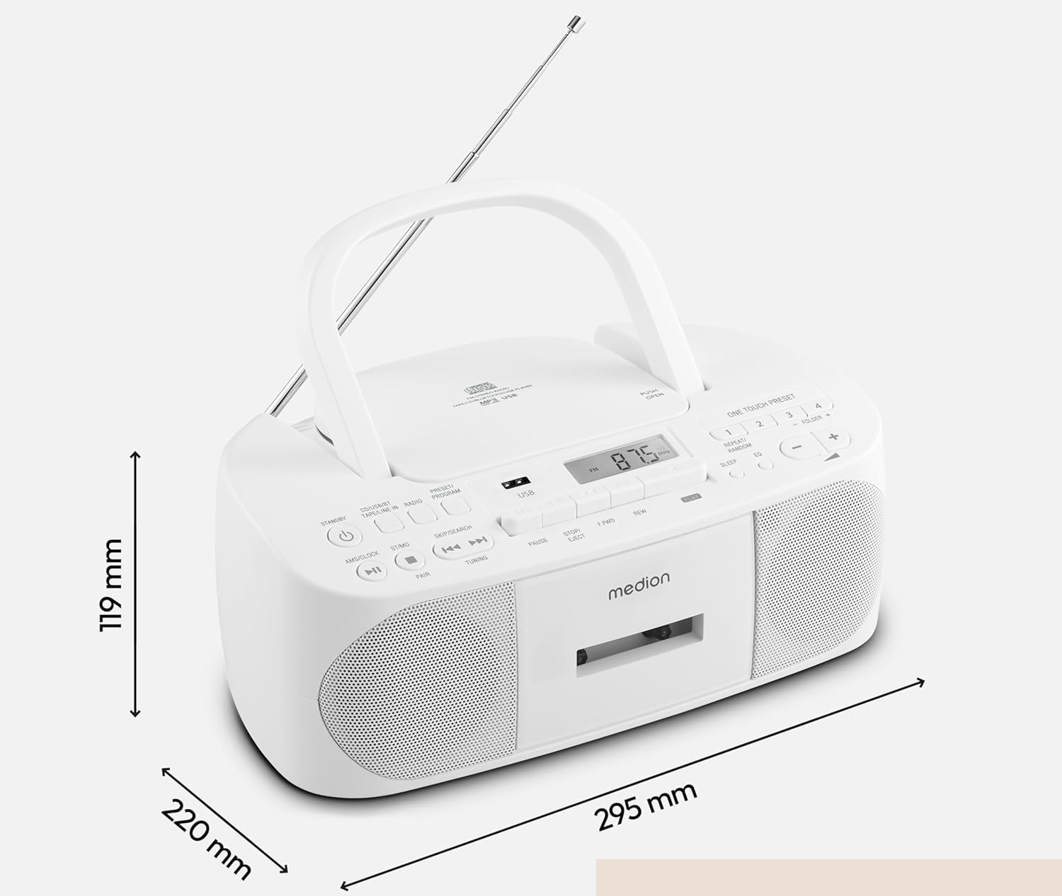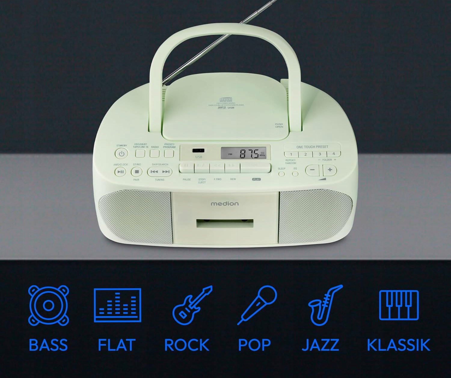 Никакое другое устройство не предлагает столько возможностей, как портативная компактная стерео система: Medion E65010 воспроизводит радиостанции FM, CD, кассеты и даже файлы MP3 из памяти USB. С помощью дополнительного ввода AUX вы можете подключить любой другой источник музыки от MP3 -плеер к смартфону. Он построил -в стереодинамиках с отличным звуком, и благодаря ручке переноски вы можете легко взять ее в любое место. p>