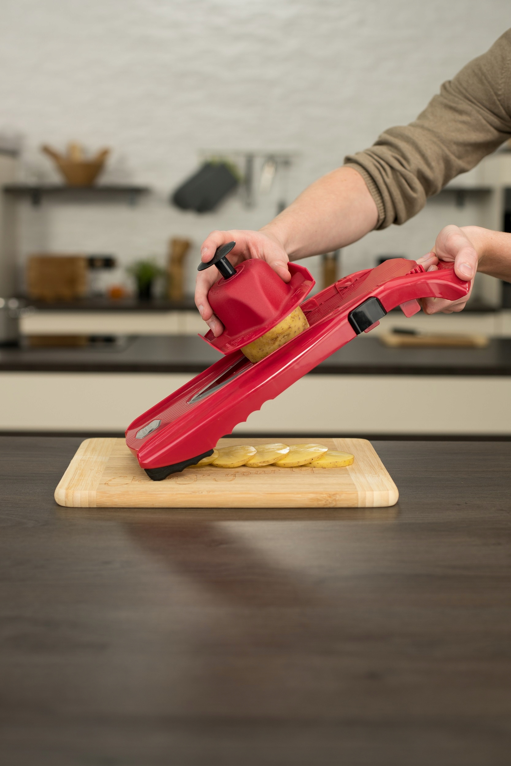 Благодаря сменным вставкам и регулировке толщины мы получим в общей сложности 10 возможностей разрезания овощей и фруктов, просто переместите вставку в соответствующее положение.