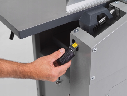 Толщина урожая регулируется с помощью ручки на задней части машины! Это гарантирует пользователю быстрое и точное регулировка толщины урожая в сочетании с чрезвычайно легким обслуживанием. Максимальная толщина сбора составляет 3 мм.