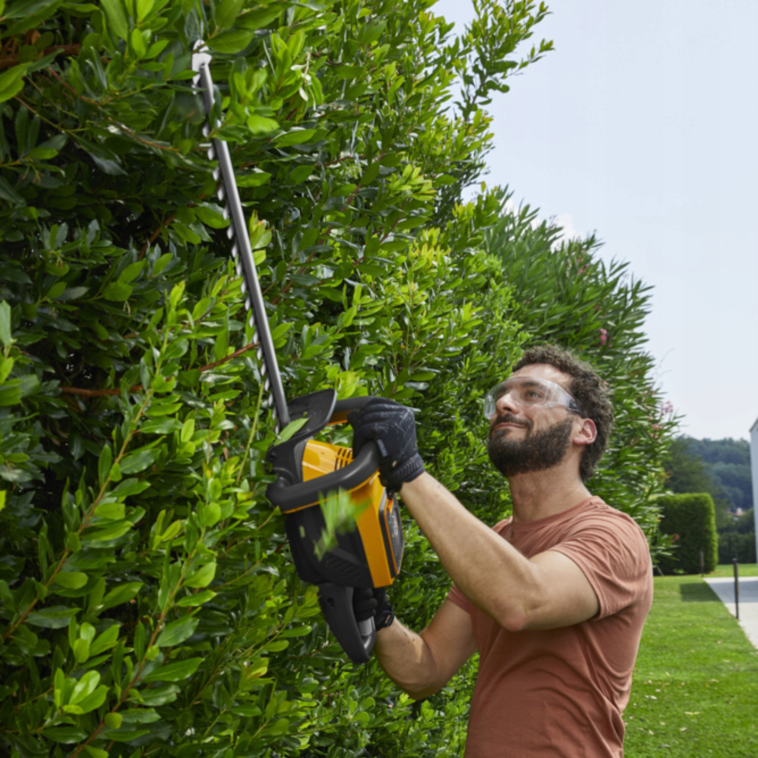 ✔ можно работать в течение 50 минут после одной зарядки аккумулятора . 58-сантиметровый нож оснащен , , который с легкостью отрезает живые изгороди и кустарники .