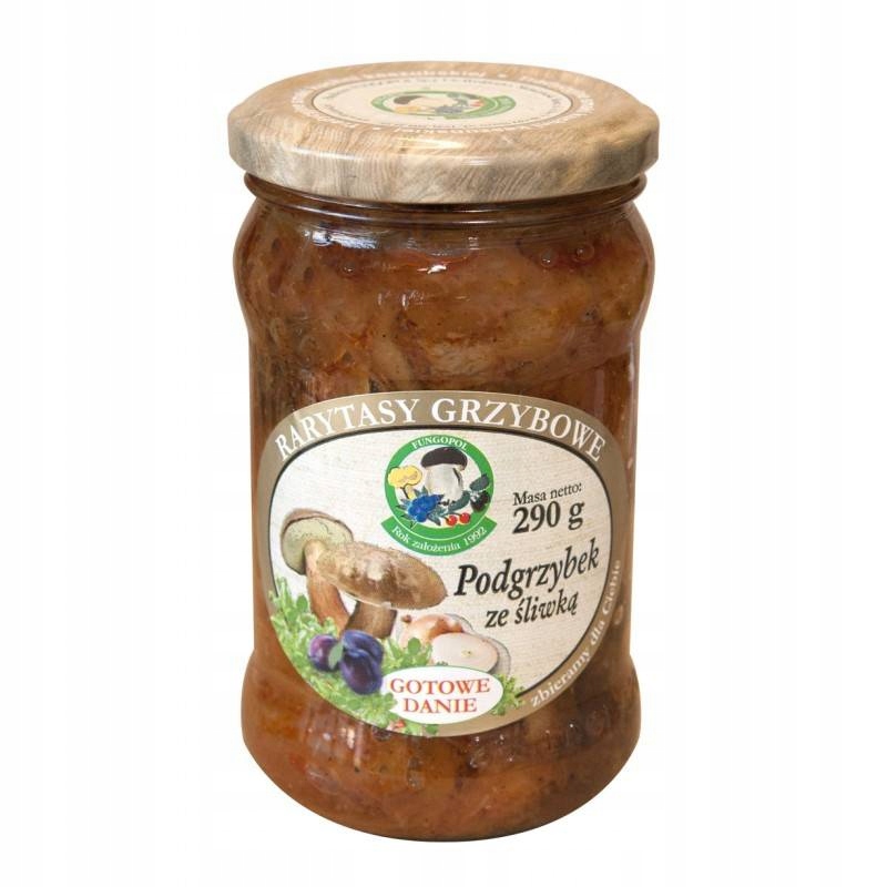 Данный продукт представляет собой разновидность салата. Уникальное сочетание грибов, тушенных в томатах и сливах, с добавлением масла. Изысканное блюдо: - начинка для вареников, вареников, котлет, запеканок; - добавка к супам, соусам, рагу. Болете со сливой. Состав: подберезовики 92%, лук репчатый, вода, масло, уксус, томатный концентрат, соль, перец, слива 1,5%. Хранить в сухом и прохладном месте, после вскрытия хранить в холодильнике. Лучше всего употреблять до окончания срока годности: дата и номер партии указаны на крышке. Стерилизованный продукт. Пищевая ценность в 100 г продукта: Энергетическая ценность 324 кДж 77 ккал Белки 2,3 г Углеводы, включая сахара 8,0 г 1,8 г Жиры, в том числе насыщенные жирные кислоты: 4,02 г 0,28 г Соль 1,49 г Вес нетто: 290 г Производство Польша.