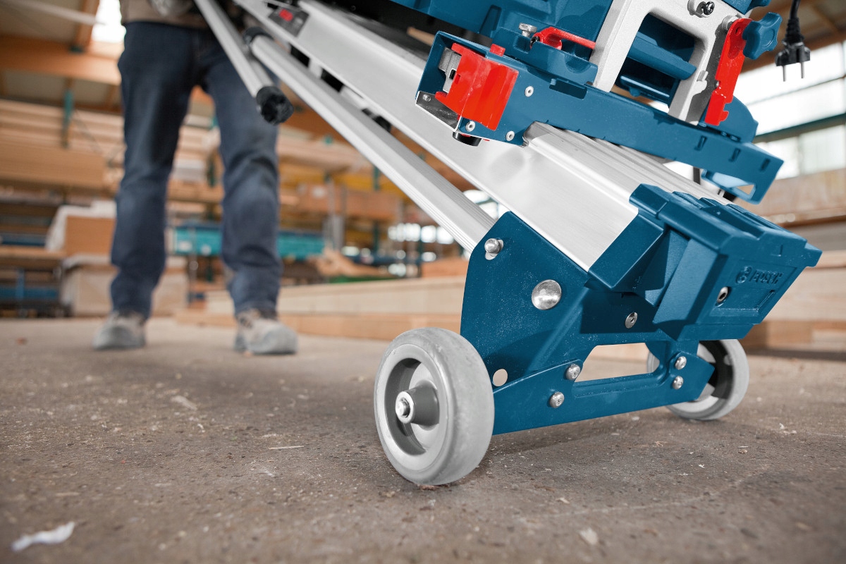 Комплект транспортных колес BOSCH позволяет очень легко транспортировать стол GTA 3800 с торцовочной пилой.