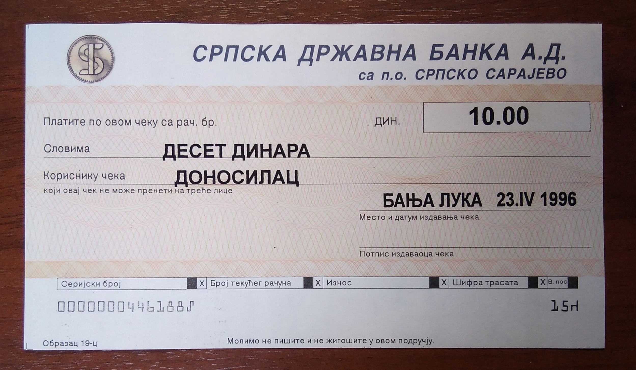 БОСНИЯ Респ. Сербский чек Национальный банк Баня-Лука