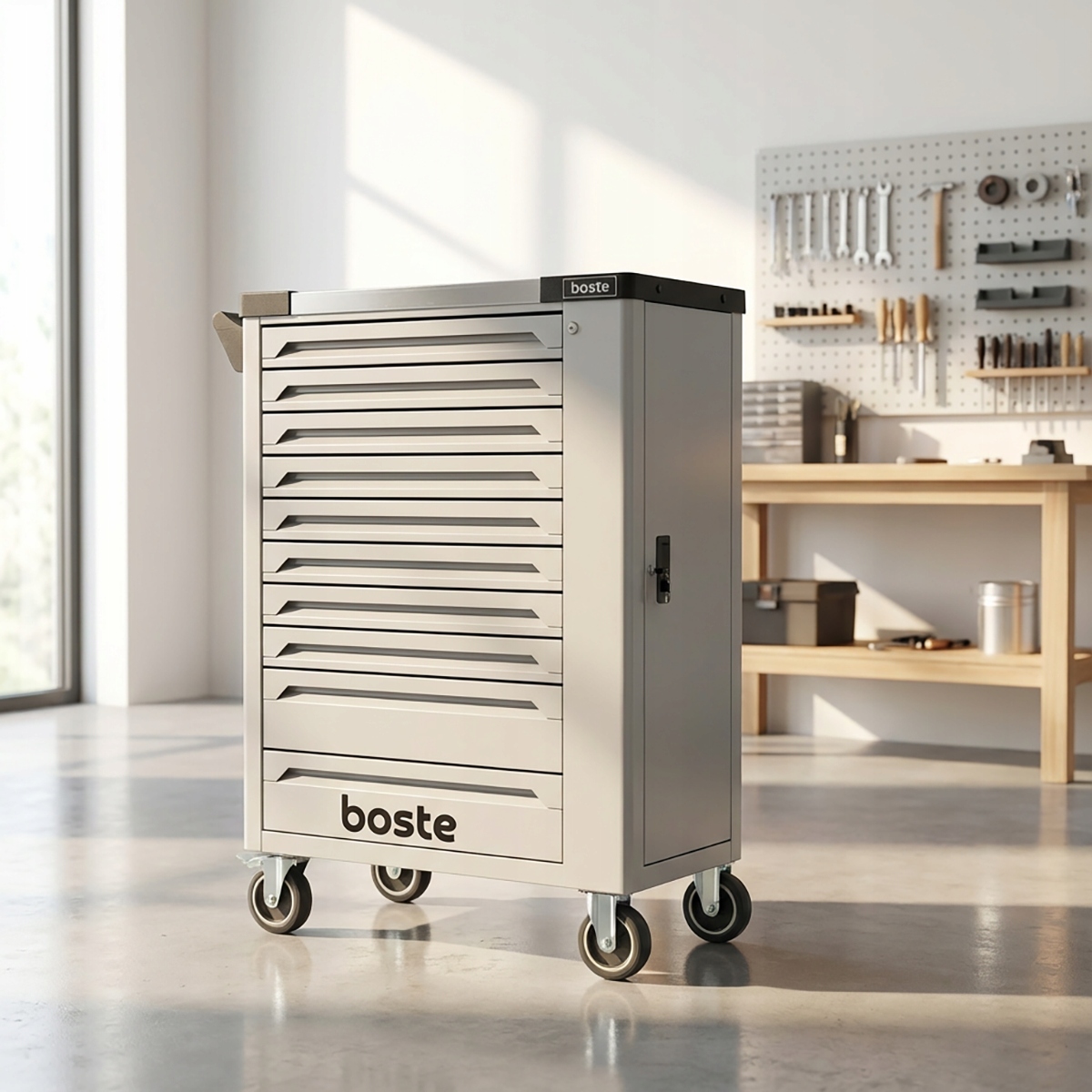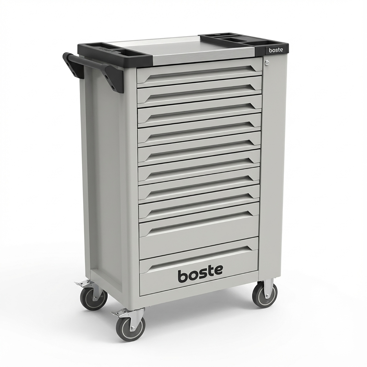 Boste Toolley R710 — это прочная тележка для инструментов, предназначенная для профессиональной организации рабочего места. Конструкция из стального листа SPCC 0,8 мм обеспечивает высокую жесткость и долговечность, а 10 ящиков на направляющих с шарикоподшипниками гарантируют плавное и надежное выдвижение при полной загрузке. Каждый ящик выдерживает до 35 кг, поэтому в нем можно безопасно разместить тяжелые инструменты и аксессуары.