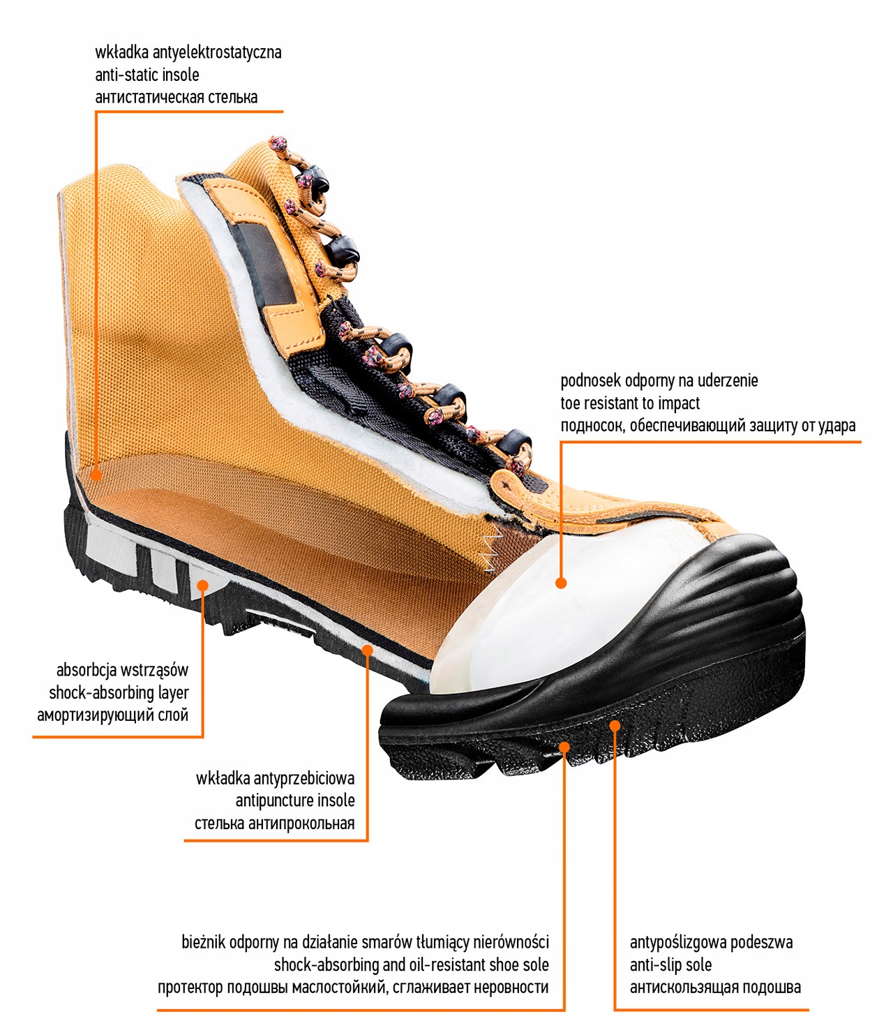Рабочие ботинки из нубука относятся к категории защитной обуви S3 SRC по . Стандарты EN ISO 20345. Ботинки NEO (82-124) предназначены для защиты ног пользователя от травм, которые могут возникнуть при авариях, они оснащены композитными подносками, предназначенными для защиты от ударов с энергией 200 Дж и от сжатия минимум 15кН, противоскользящая, устойчивая к истиранию подошва с системой, поглощающей удары, масла, бензин и другие органические растворители, устойчивая к скольжению по керамической подложке, покрытой раствором лаурилсульфата натрия (SLS), и по стальной подложке, покрытой глицерином. Обувь имеет встроенную антиперфорационную вставку, защищающую от проникновения с земли, и антиэлектростатическую вставку. Их водонепроницаемость повышает комфорт работы в сложных условиях. Рекомендуется для рабочих мест, складов, строительных площадок, механических заводов и везде, где требуется использовать обувь, безопасную в своем классе защиты. Товар прошел оценку соответствия и соответствует стандартам, действующим в Европейском Союзе.