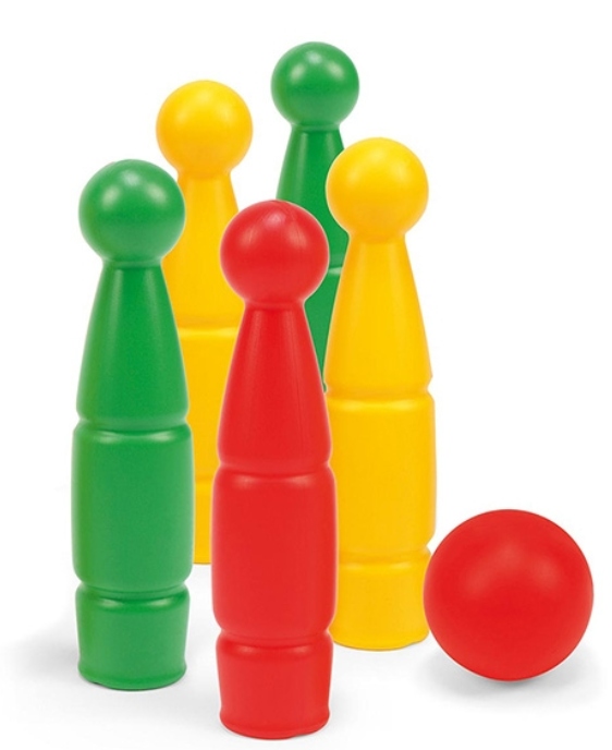 - В набор входят 5 разноцветных кеглей для боулинга и 1 мяч