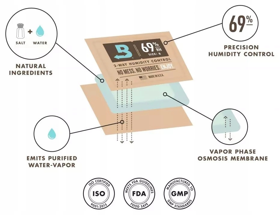 Эта специальная мембрана позволяет Boveda обеспечивать двусторонний контроль влажности сигар. Боведа компенсирует атмосферу внутри хьюмидора. Всякий раз, когда необходим пар, Boveda выделяет чистейшую и очищенную влагу. Если в хьюмидоре слишком много влаги, Boveda впитывает лишнюю влагу.