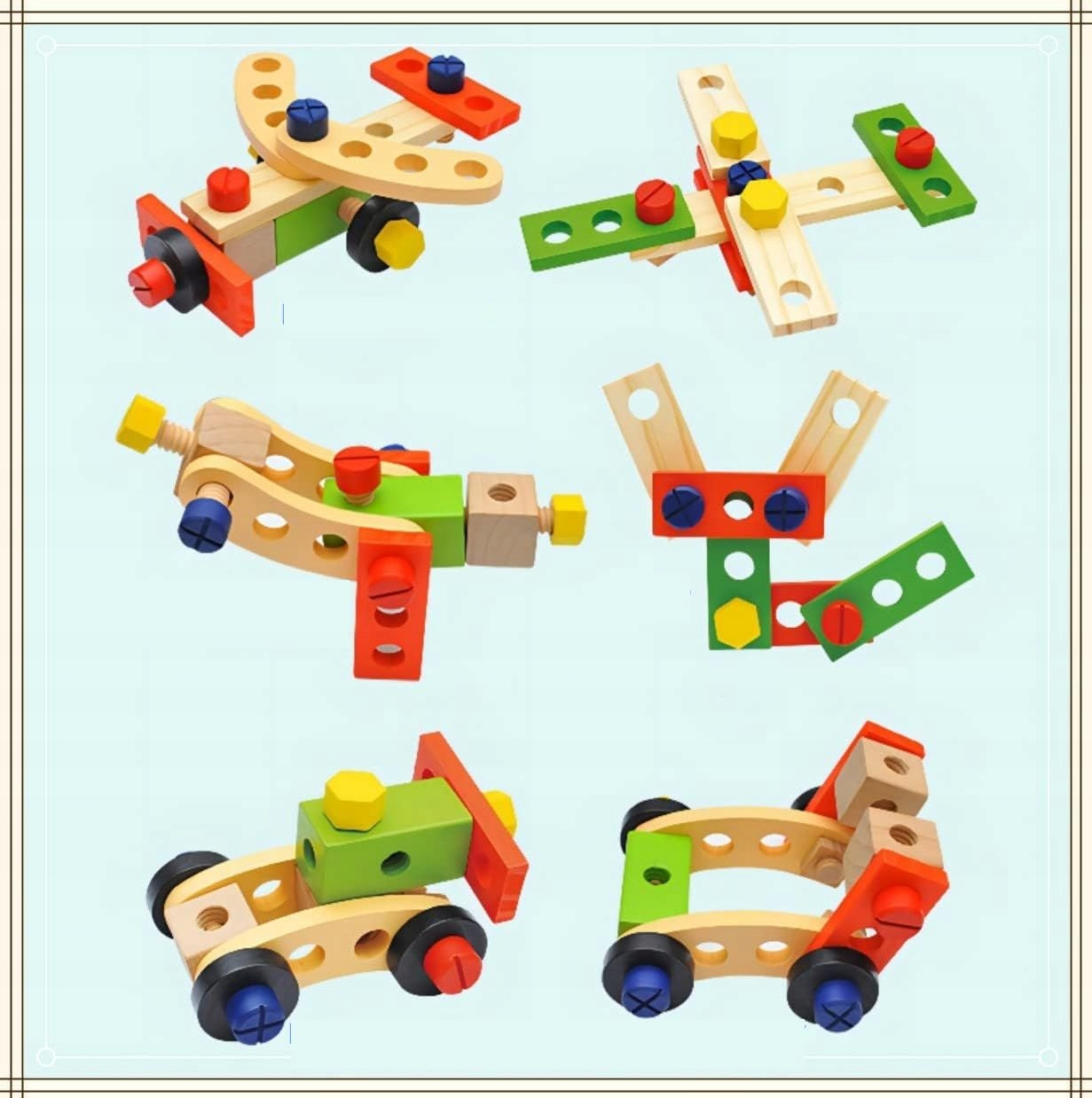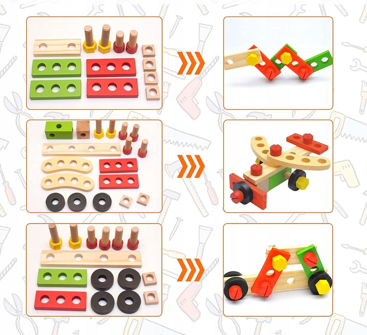 - 【Набор ценностей】: этот детский набор деревянных инструментов сочетает в себе все необходимые инструменты и аксессуары, молотки, гаечные ключи, плоскогубцы, линейки, пилы, отвертки, гайки, шайбы и т. д. Дети могут создавать свои любимые фигуры с помощью различных деревянных инструментов.
