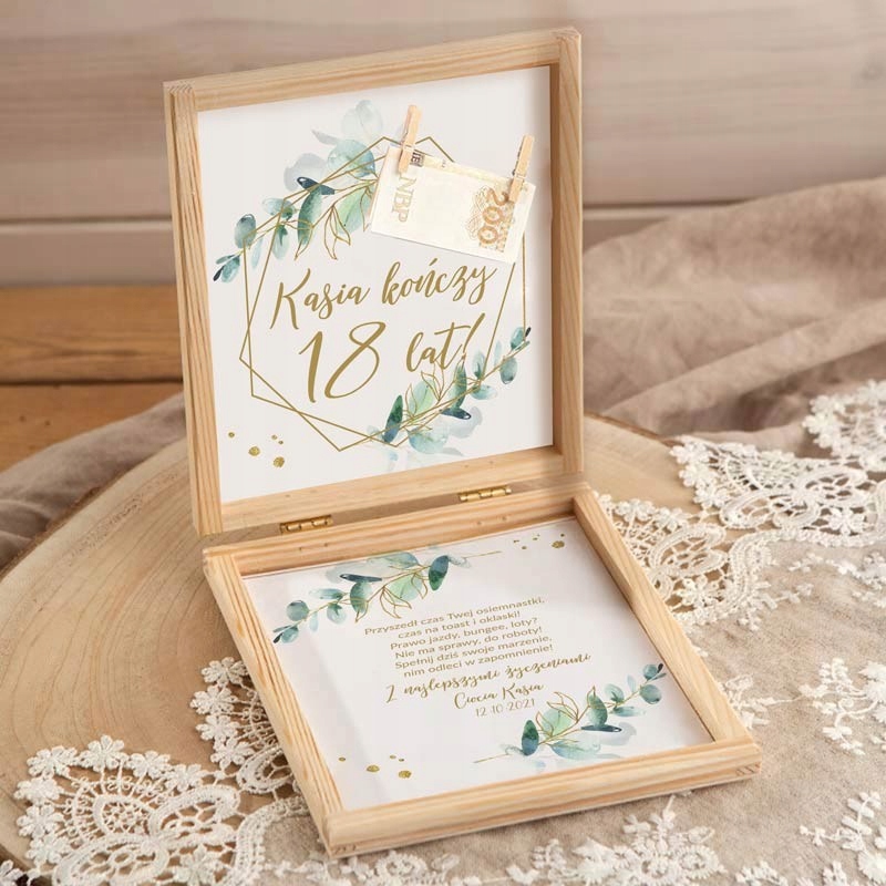Ботаническая копилка на 18 лет, украшенная графикой ветвей эвкалипта. Коробка именная, поэтому тоже станет сувениром этого дня. В коробке есть клипсы для крепления денег. Внутри приклеены две бумажки с пожеланиями. Это отличная альтернатива традиционному конверту.
