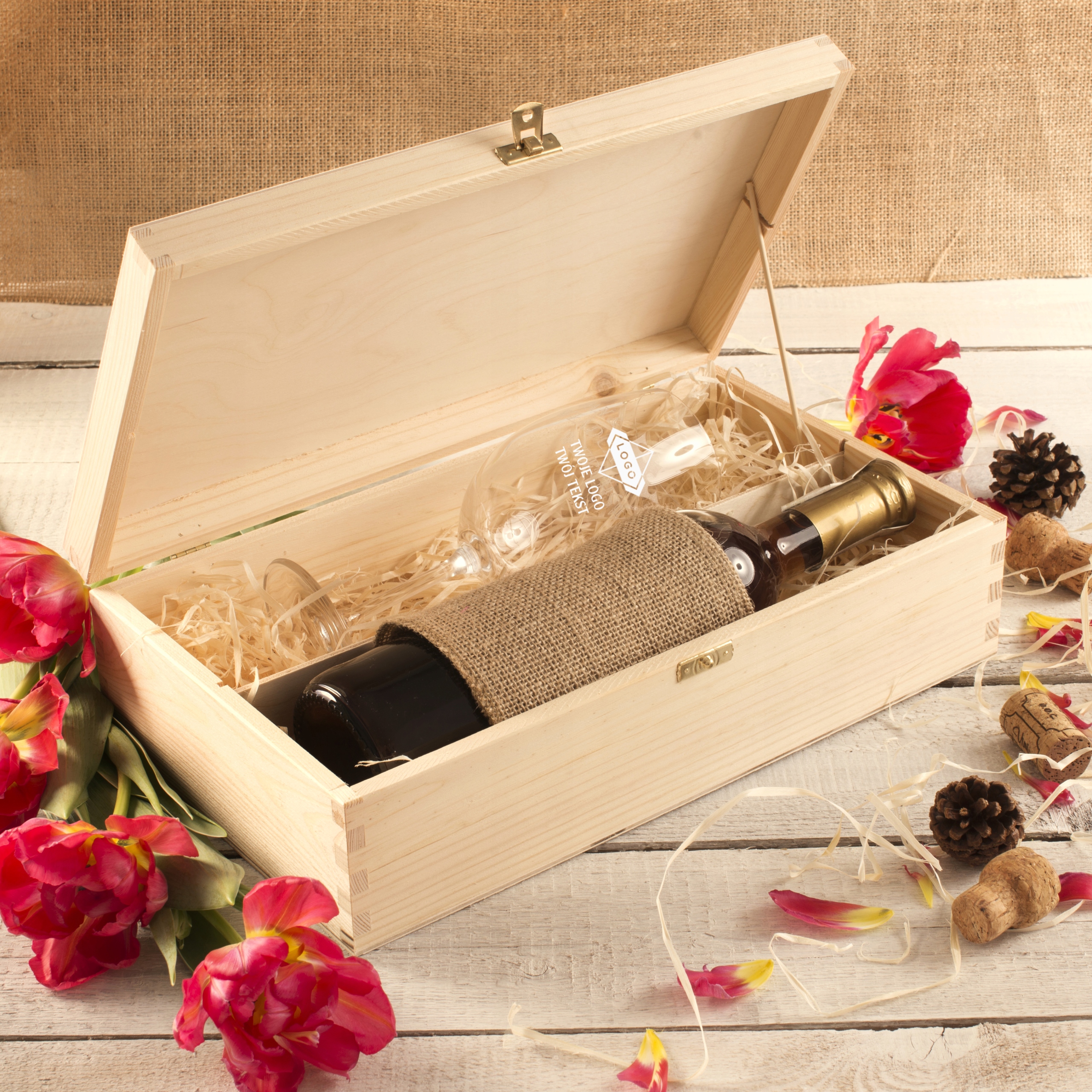 Подарите уникальный подарок, сочетающий в себе элегантность и практичность. Бокал помещен в прочную коробку из натурального дерева с золотой защелкой. На крышке возможно размещение принта с логотипом вашей компании или выделенной надписи, придающей подарку индивидуальный характер.