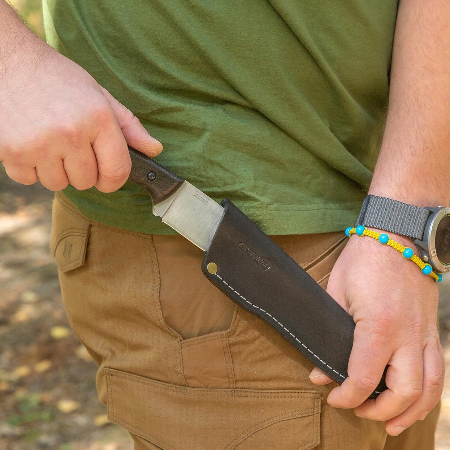Кожаный чехол ручной работы с петлей для ремня позволяет носить нож вертикально, что делает его идеальным ножом для повседневного использования. Чехол изготовлен из кожи премиум-класса высочайшего качества.