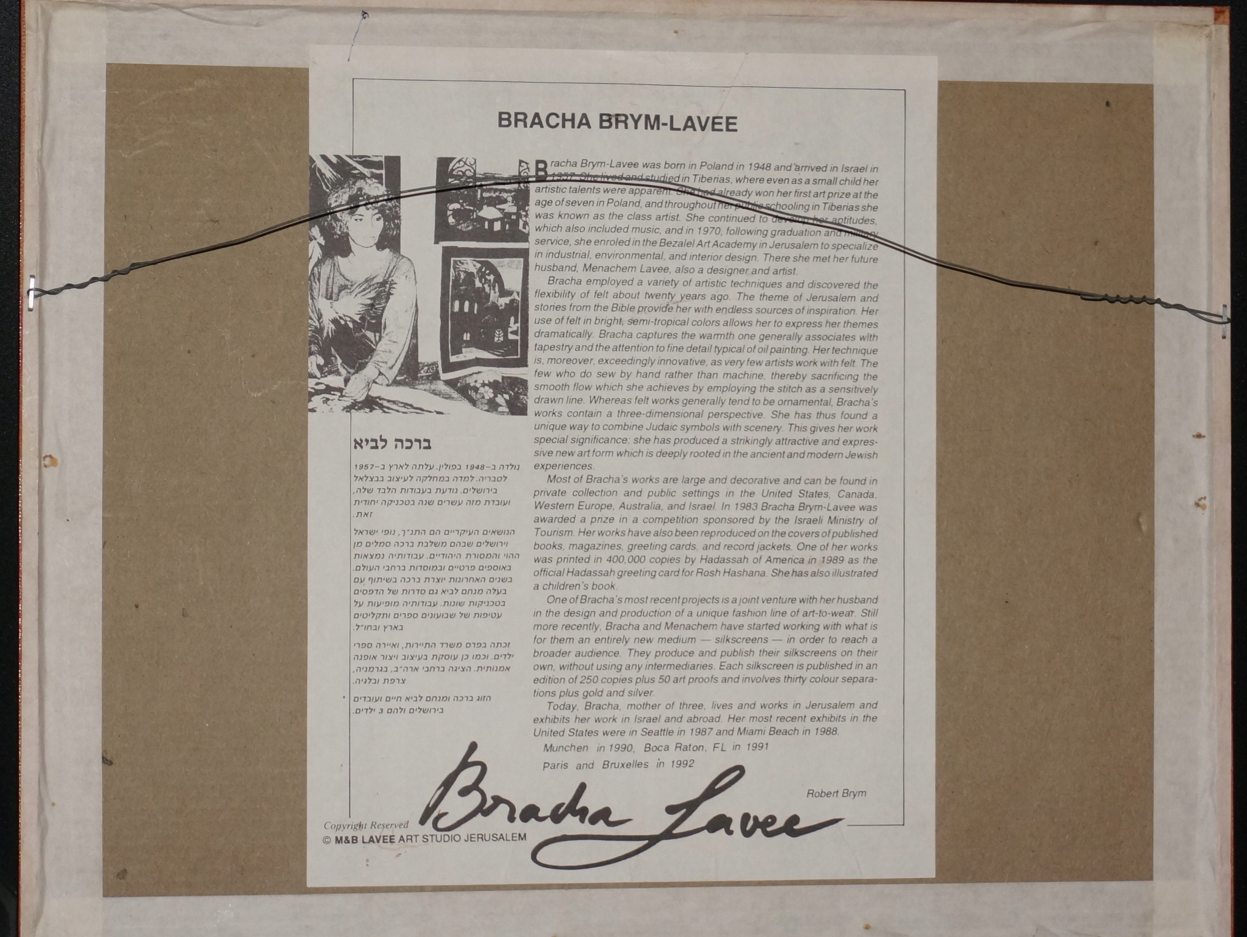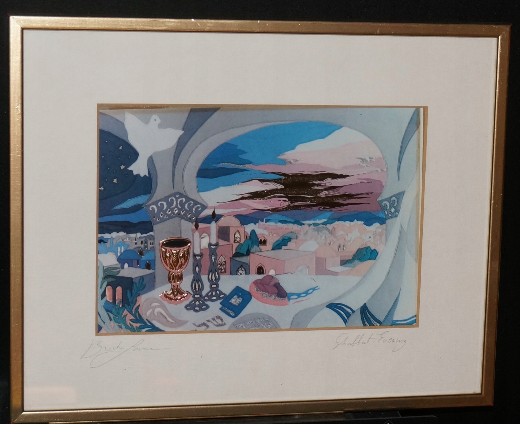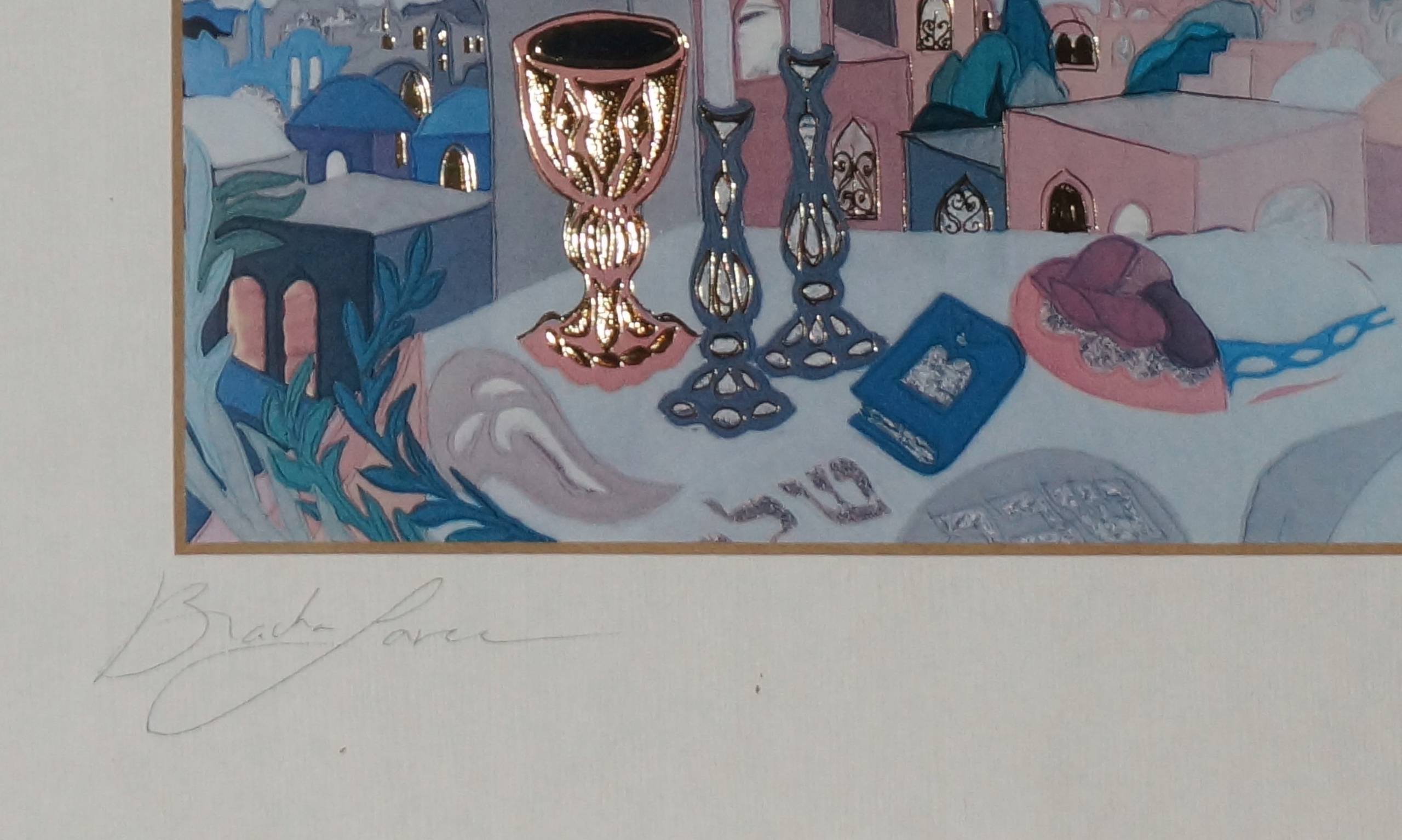 Я предлагаю вам цветную литографию с подписью Браха Брим-Ливи — Мой Шаббат. Родившаяся в Польше, она переехала в Израиль в 1957 году. Ее искусство сосредоточено на темах Иерусалима, Израиля и Библии. Яркие цвета, красиво подчеркнутые золотом. Рекомендую!!!