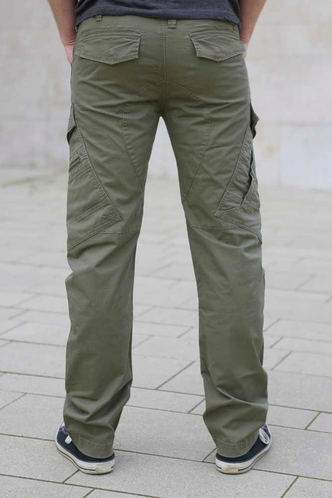 Штаны имеют 7 карманов из которых 3 косой на бедрах. сшит под углом , чтобы сделать их более доступными. Эти карманы прикреплены (2 для кнопок и 1 для молнии). Два задних кармана также имеют клапан и закрыты кнопками. Дополнительный кусок материала был сшит на спине, чтобы укрепить это нежное пространство.