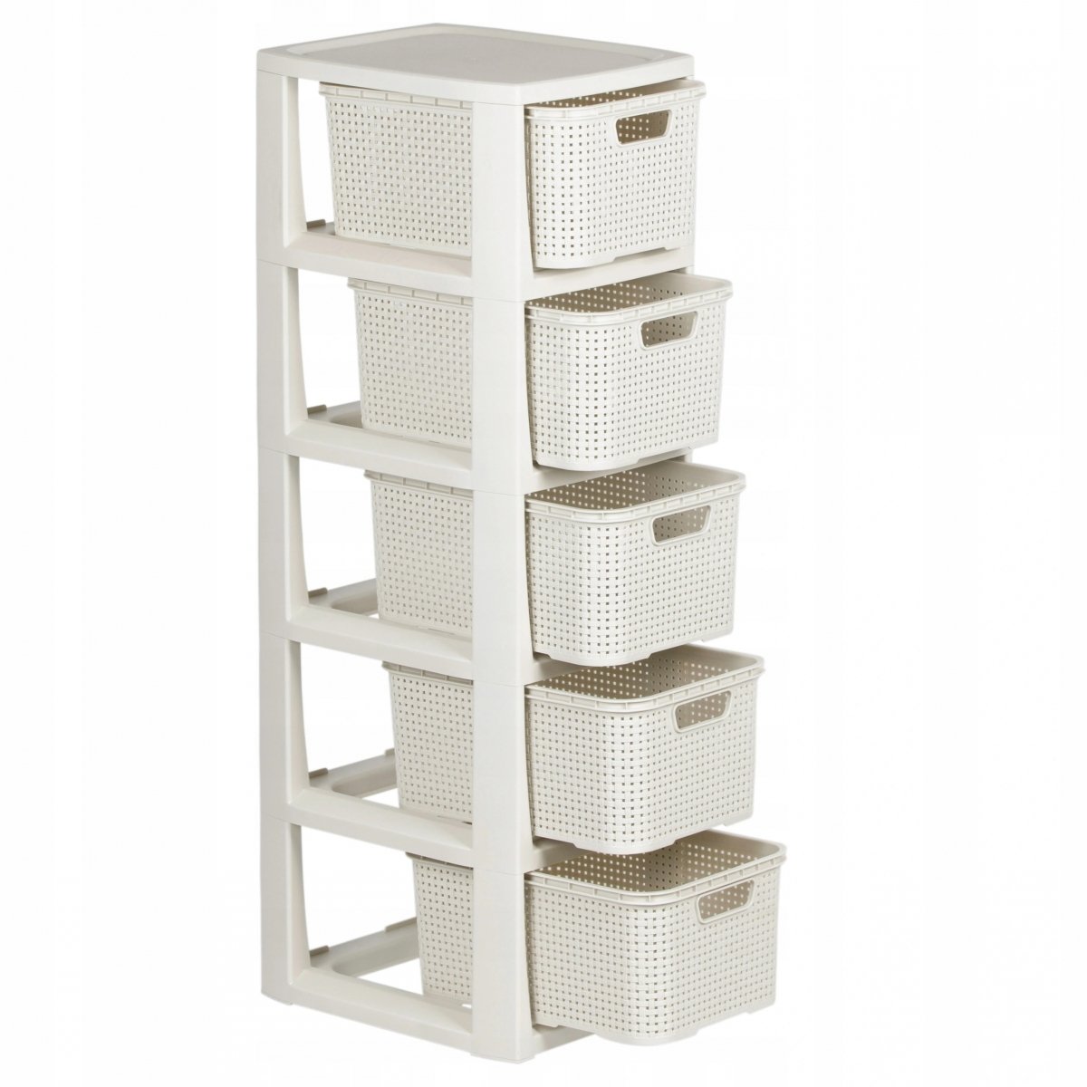 Модель состоит из пяти вместительных контейнеров, выполняющих роль выдвижных ящиков, отделанных пластиком высочайшего качества, пригодным для вторичной переработки и полностью не содержащим вредных ингредиентов. Благодаря отверстиям на передних стенках мы легко выдвигаем ящики с полки. Подставка легко чистится, устойчива к влаге и механическим повреждениям.