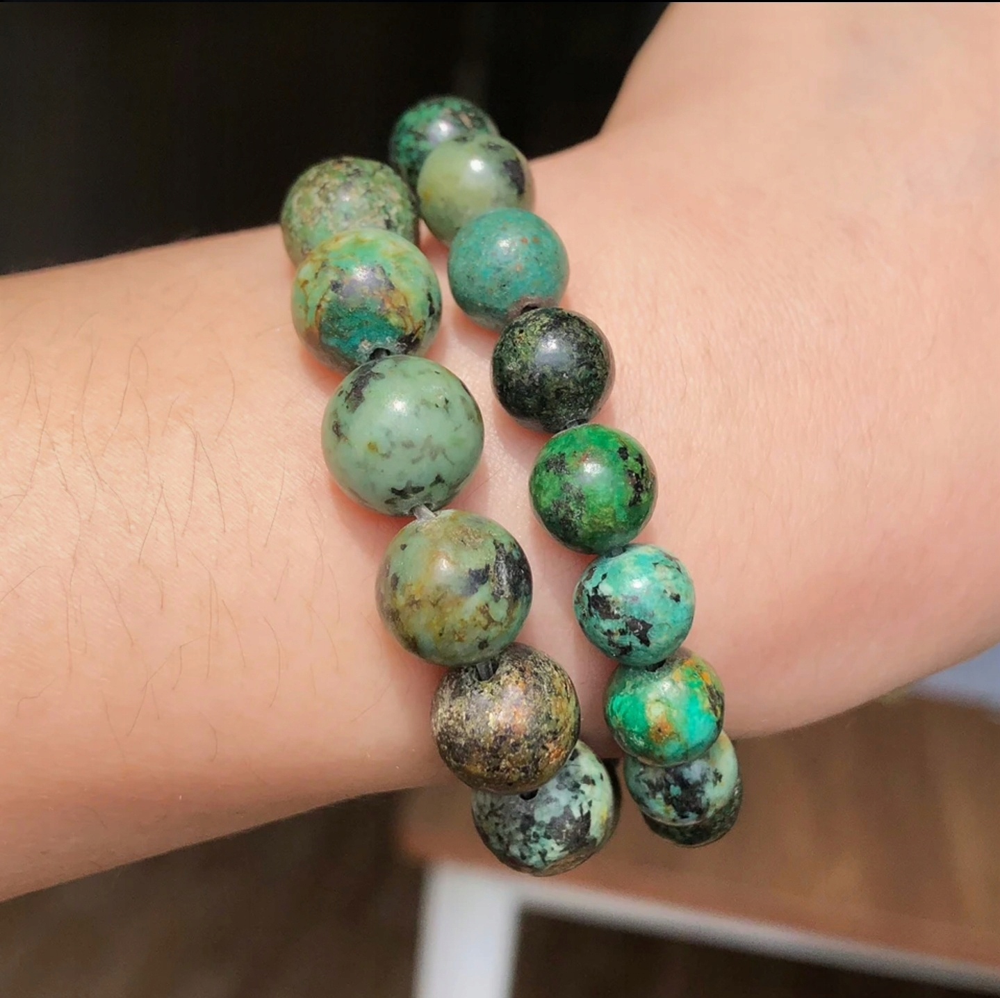 Зеленый в сотнях оттенков набор из 3-х браслетов по 8мм из зеленого нефрита, африканский Бирюза и черный оникс. Очень интересная стилизация с уникальными камнями...