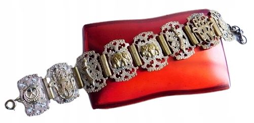 Предметом аукциона является браслет, который виден на фото. Оно было привезено из Германии – куплено в ювелирном магазине Trodelhalle. Он изготовлен из латуни. Когда-то он был покрыт серебром, как видно на фотографиях. Состояние как на фото.