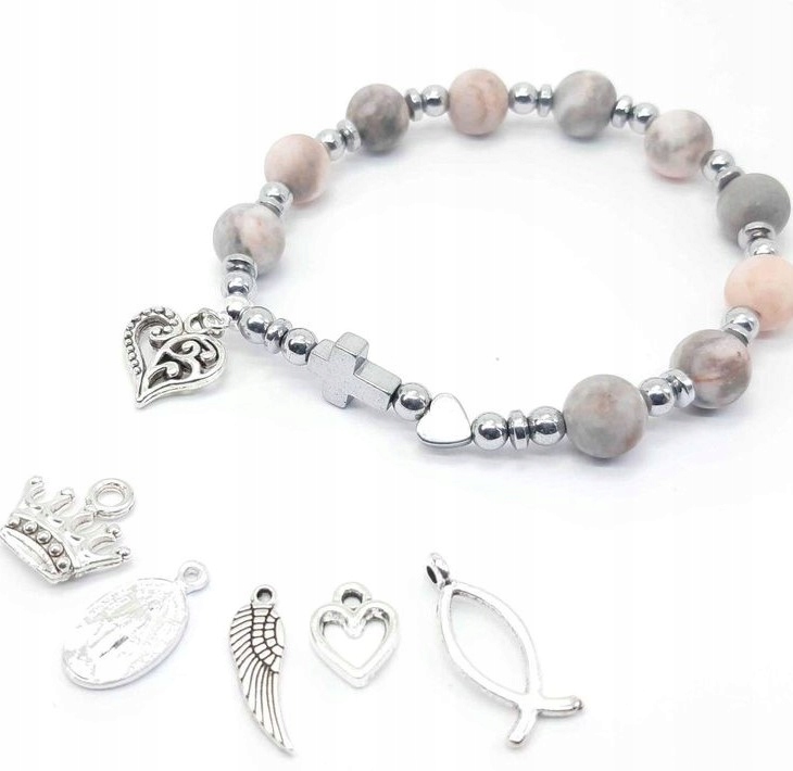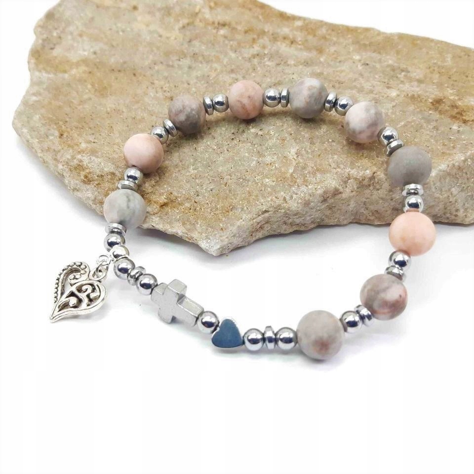 Браслет с десятой частью четок ручной работы из полу -драгоценные камни яшма (размер бусины 8мм) и гематит (проставки, сердечко, крестик).