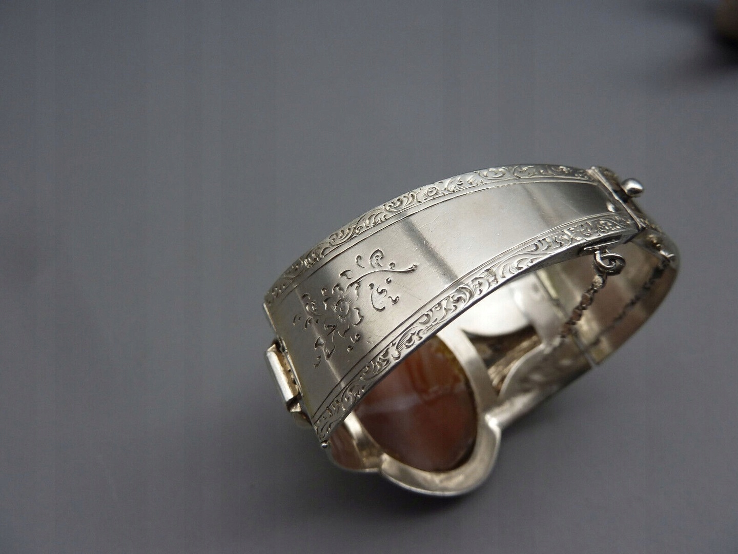 Уникальный браслет, изготовленный в серебре. Декорирование - Огромная Камеа - Джемма (выпуклость), сделанная в раковине. Размеры браслета - медальон 4.1 x 3,6 см, камеа 3,8 х 3,4 см, высота около 1,4 см. Длина браслета около 17,5 см. Вес 35,100 грамм. Голова собаки дважды. Условие, как на фотографиях