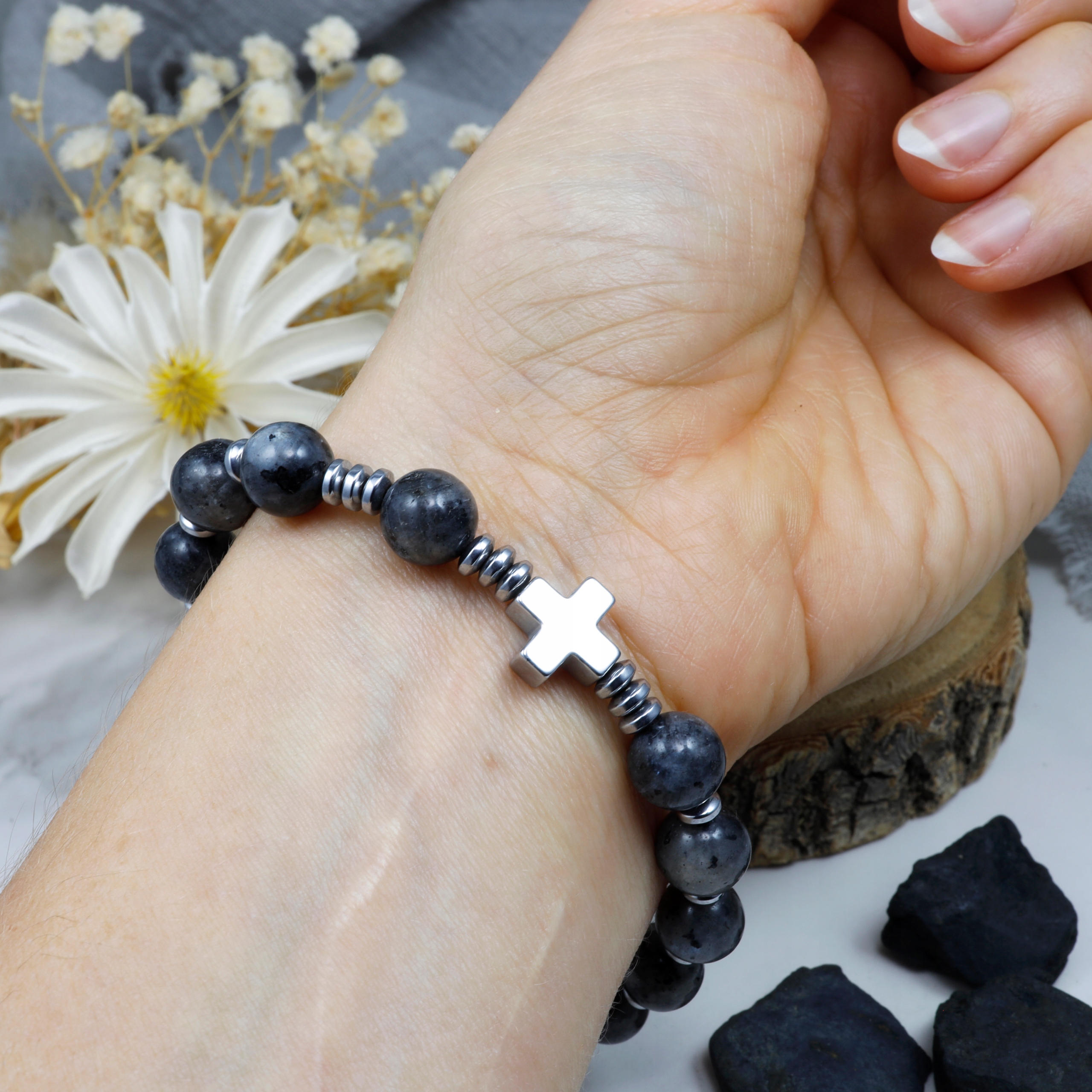 Браслет из декоративных камней - ларвикит (иначе норвежский лабрадор) и гематит на прочной силиконовой ювелирной резине.