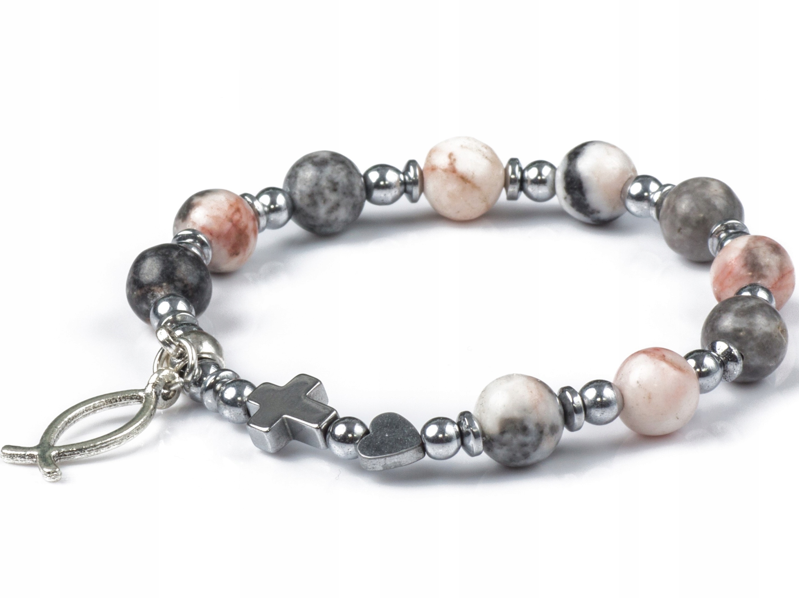 Браслет с десятой четок ручной работы из полу -драгоценные камни Родонит (размер бусины 8мм) и гематит (проставки, сердечко, крестик).