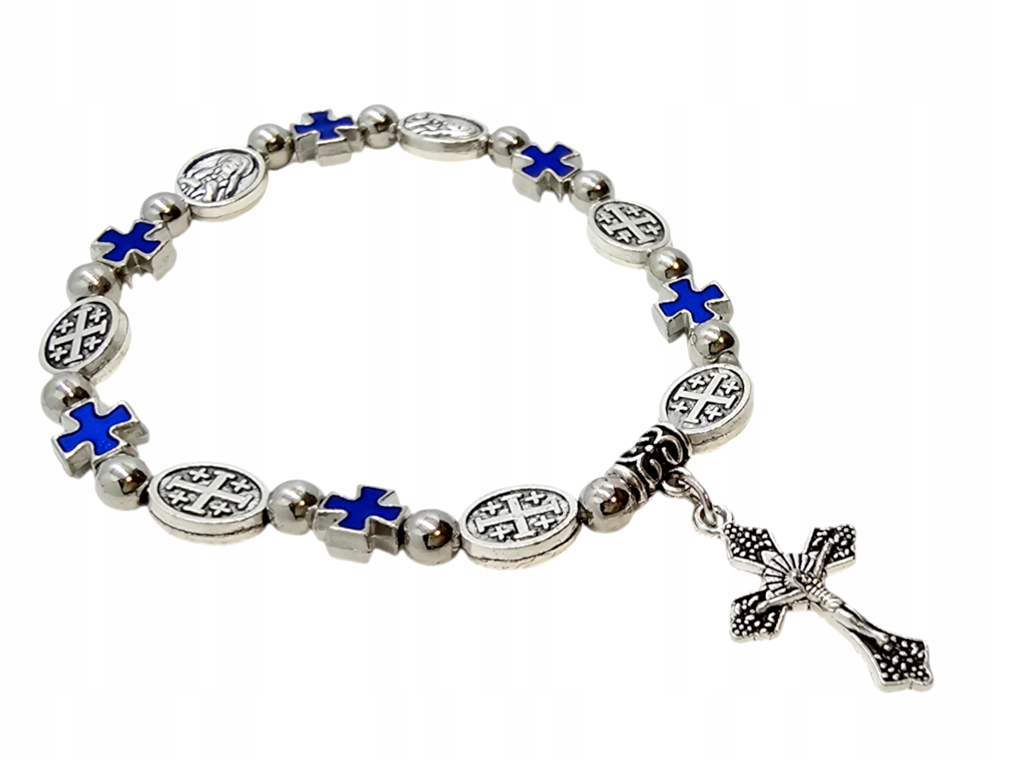 Всё венчает красивый крестик размером 25х15 мм, который является тонким и в то же время ясным отсылкой к христианской символике. Изготовленный из прочного металла, браслет устойчив к повседневному использованию, а его классический дизайн с нежным синим акцентом позволяет сочетать его со многими стилями.