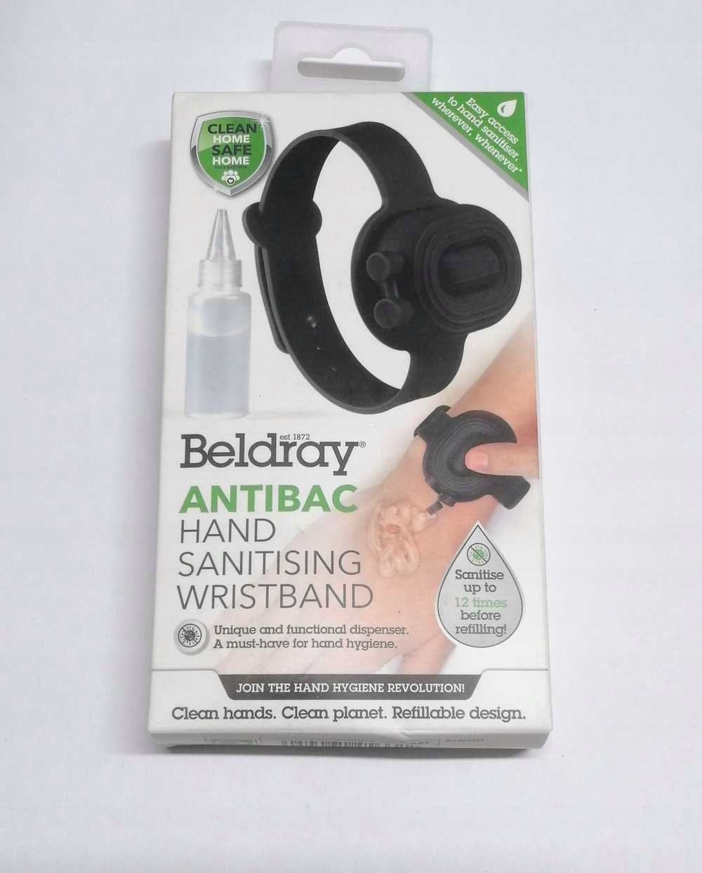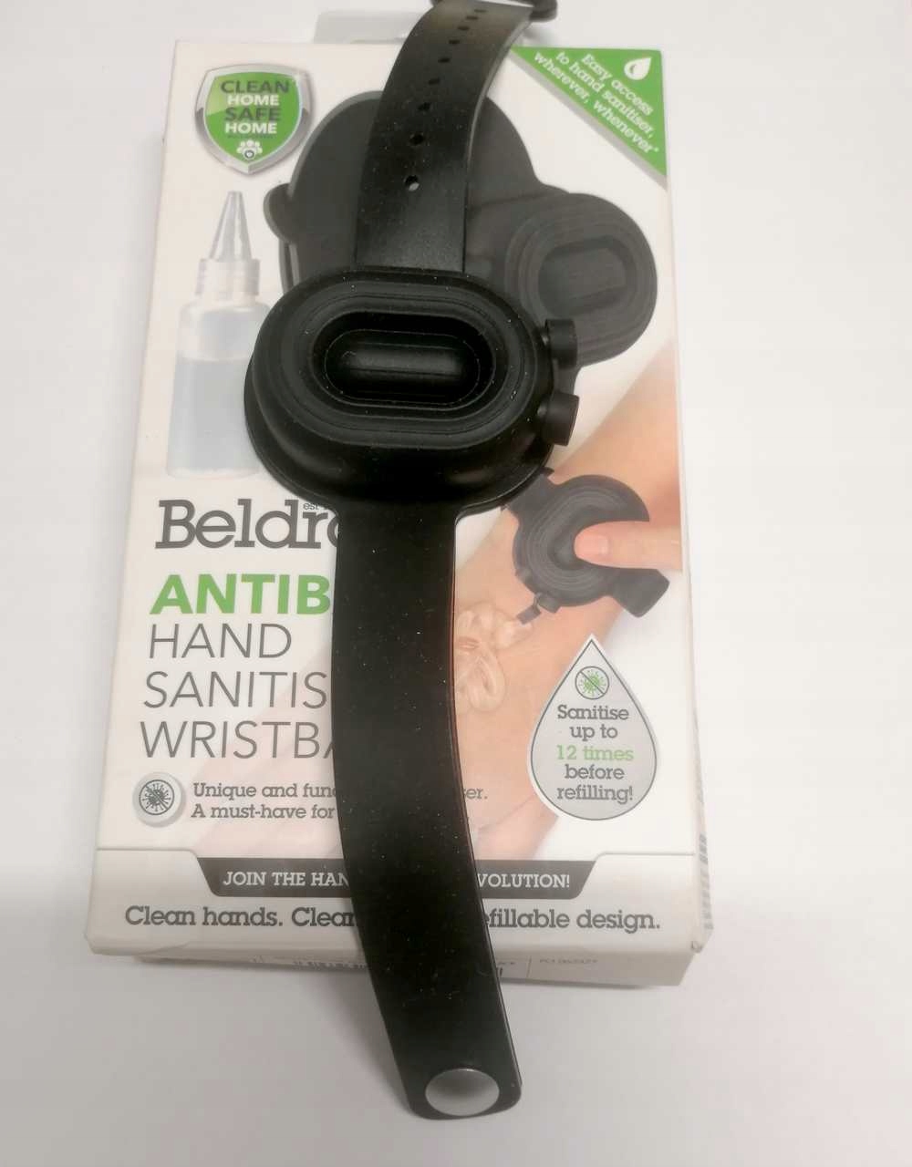 - Практично — наденьте ее на запястье или прикрепите к рюкзаку и, при необходимости, снимите небольшое количество дезинфицирующего геля для рук.