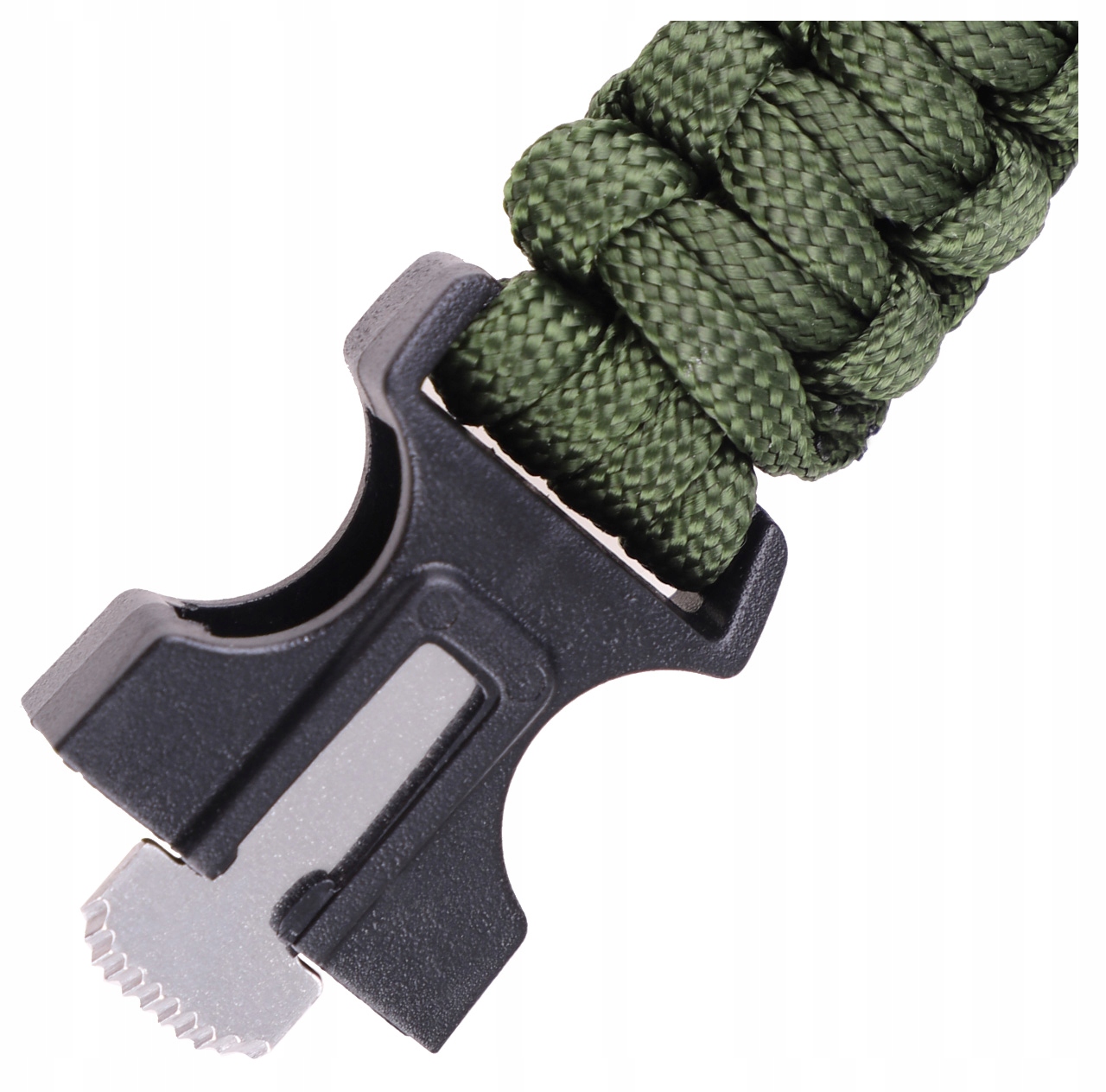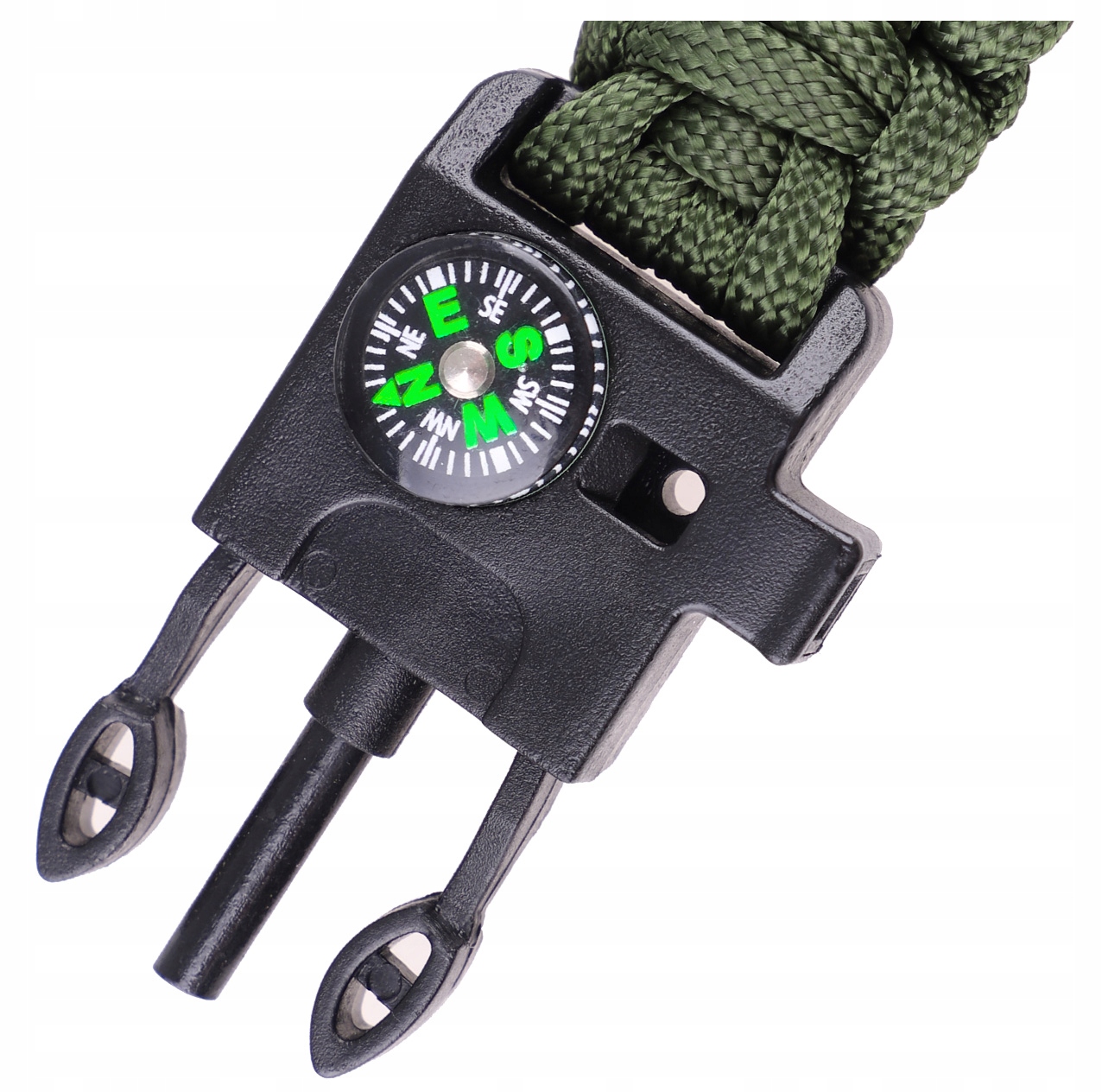Застежка браслета содержит зажигалку, компас, спасательный свисток и пластина, которая может выполнять роль небольшого клинка.
