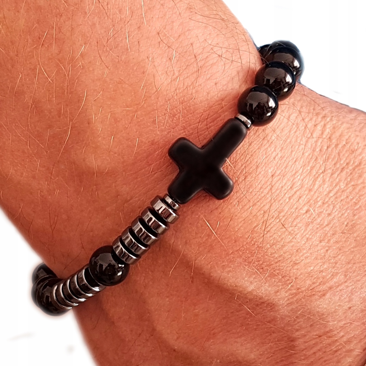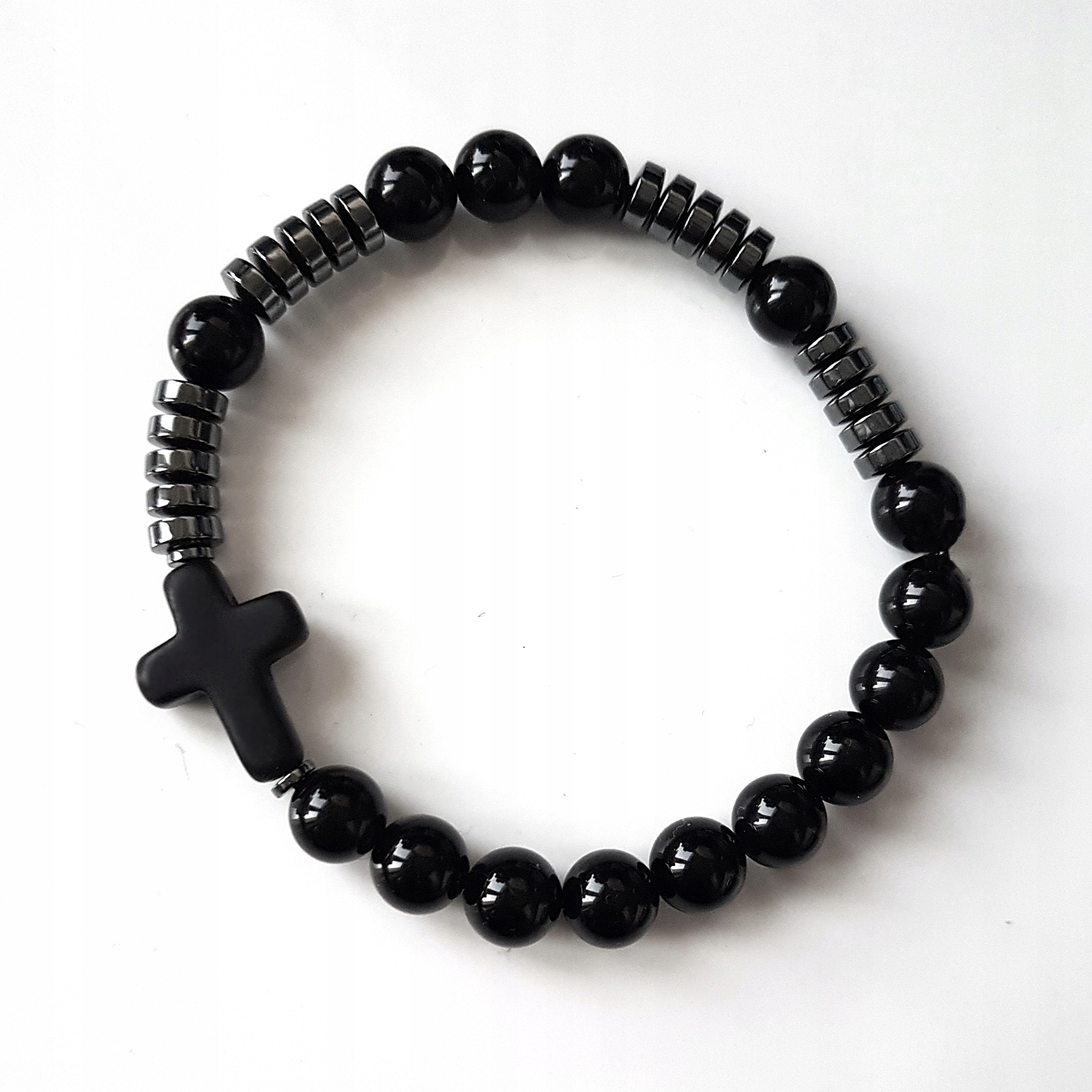 Материал - полированный оникс 8 мм, крест 19 мм, гематит, прочный силиконовый ювелирный ластик