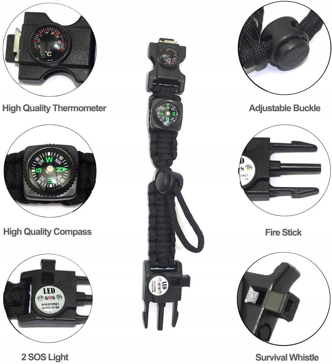 ▲ Инструмент для выживания 8 в 1: это полноценный браслет выживания из паракорда. В комплект входят: высококачественный компас, зажигалка с зажигалкой, аварийный свисток, термометр, веревка для зонта, светодиодная подсветка, многофункциональный инструмент, кард-ридер, идеальный аксессуар для кемпинга, охоты, походов и других видов активного отдыха.