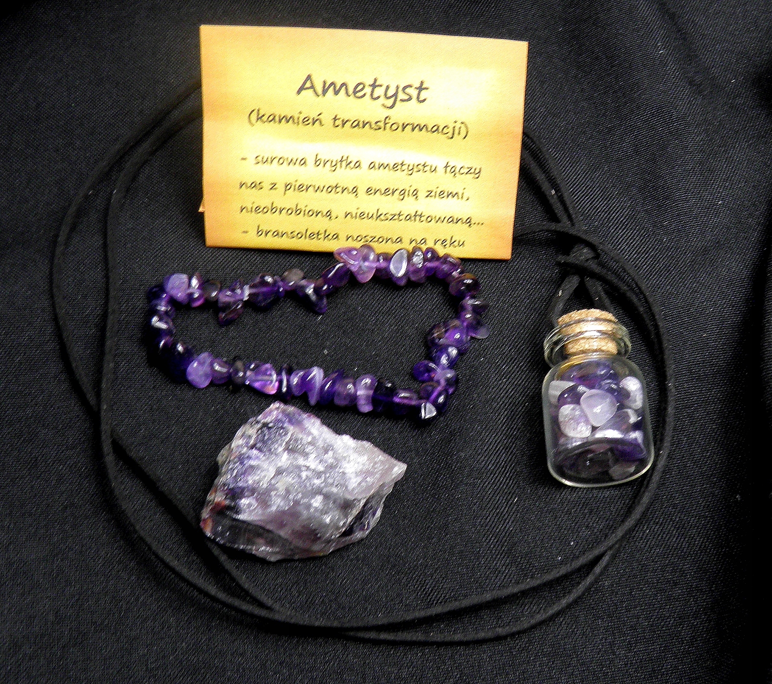- подвеска в виде стеклянной бутылочки, наполненной мелкими аметистами, на ремешке.