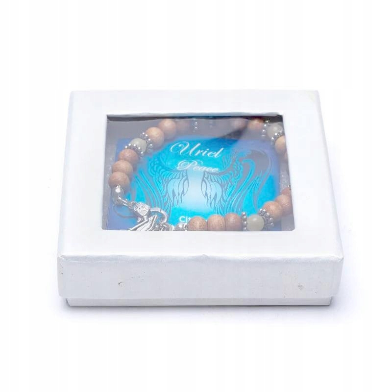 Бусины браслета выполнены из дерева, пропитанного тонким ароматом пачули, металла декоративные элементы и бусины из лимона. Бусы нанизаны на очень прочную, гибкую ювелирную нить, а браслет застегивается на карабин. Миниатюра Архангела имеет высоту 2,5 см, на гладкой реверсе выгравировано слово «Уриэль». Миниатюра и другие металлические элементы изготовлены из сплава цинка.