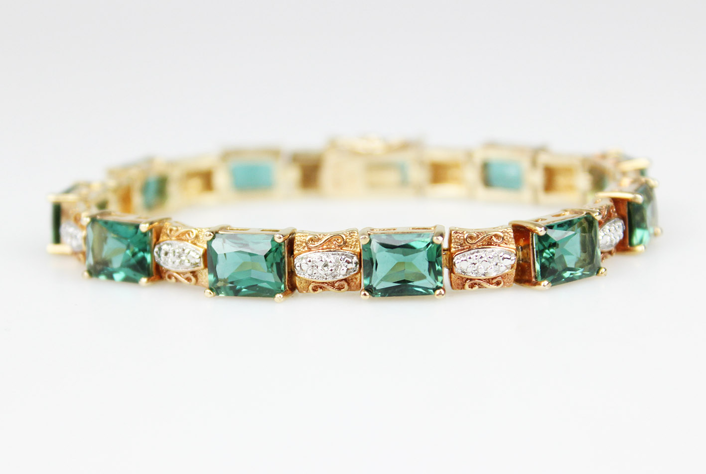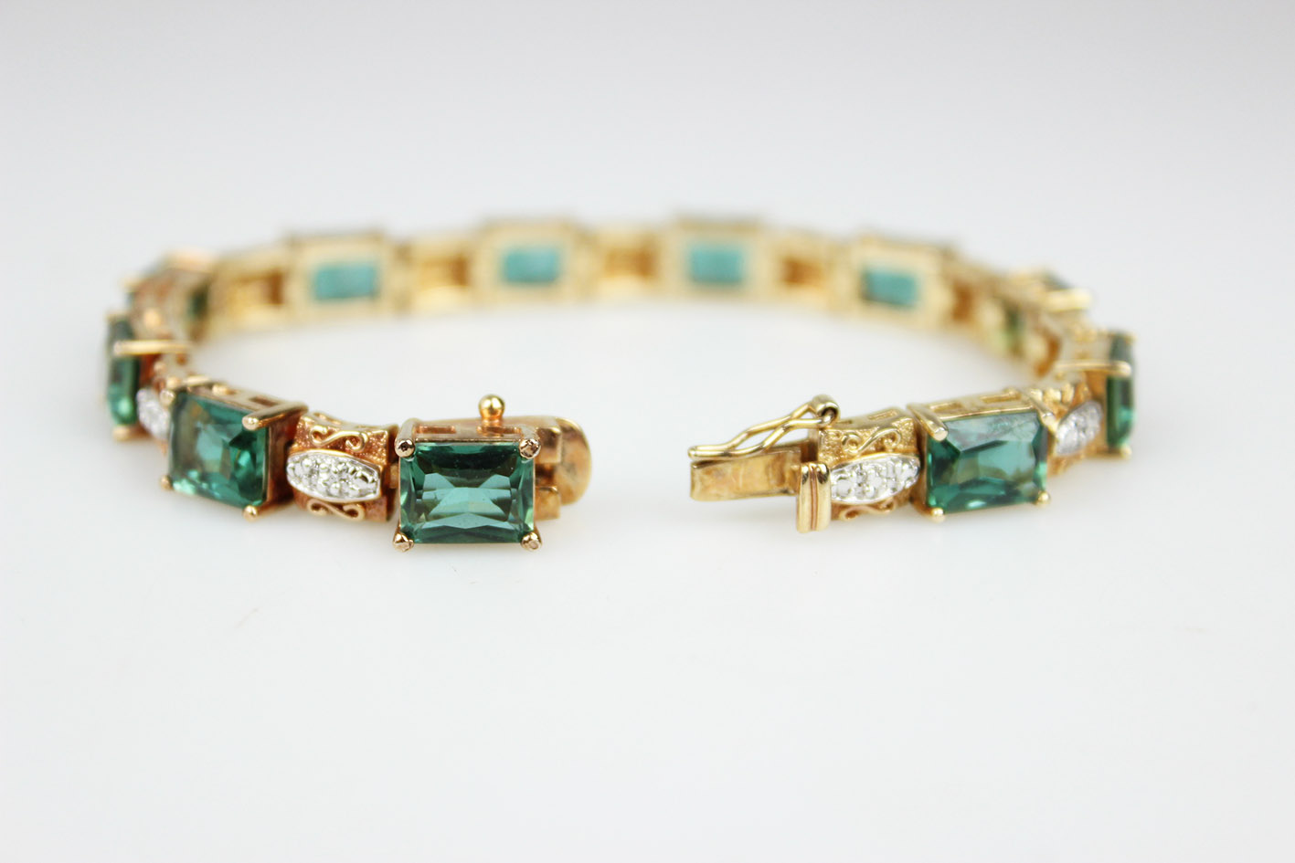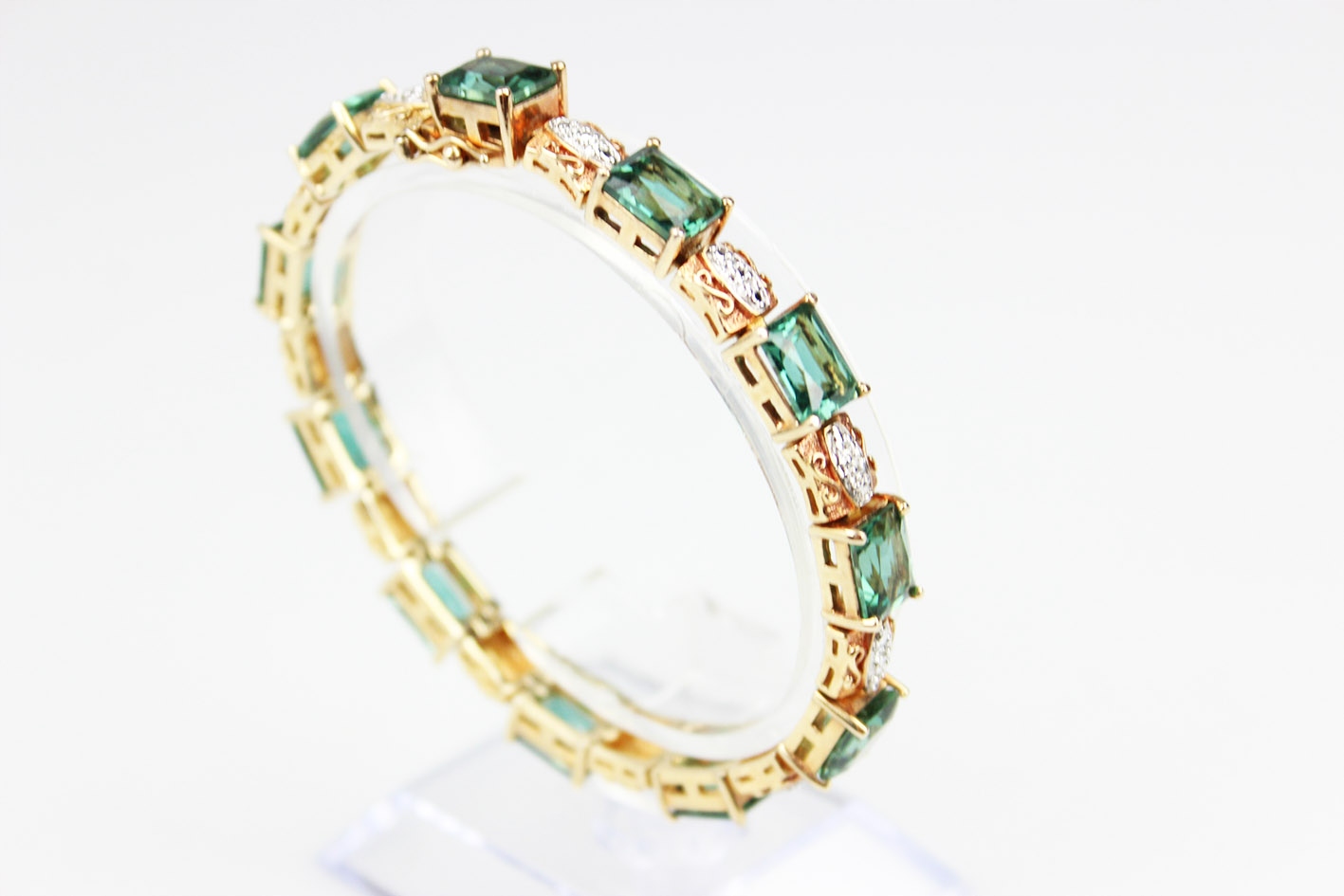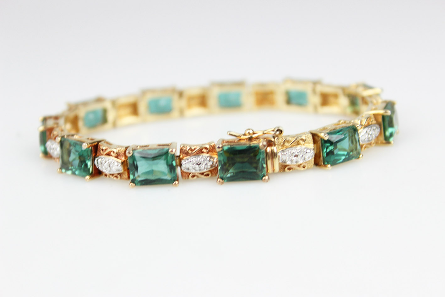 Элегантный классический браслет 1980-х годов. Изделие выполнено из позолоченного серебра с родиевым покрытием. В оправе использованы ограненные камни эльбаиты (турмалины) насыщенно-зеленых оттенков, красивой огранки и высокой прозрачности. Каждый камень разделен декорированным звеном, усыпанным, среди прочего, двумя бриллиантами, что придает всему изделию изысканный характер.