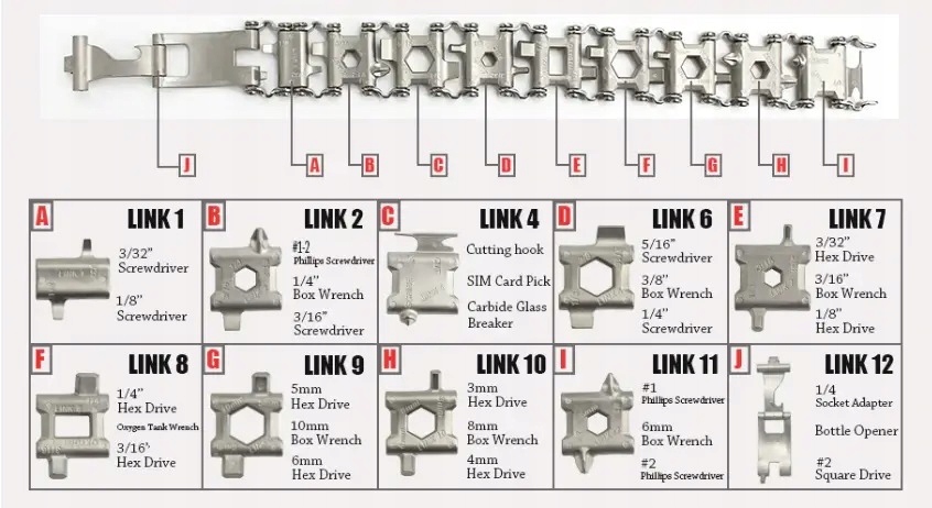 Каждая ссылка может быть удалена или заменена - в зависимости от ваших потребностей. Браслет заменяет целую кучу инструментов и удобно надевает на запястье, оставляя ваши руки свободными. Он изготовлен из хорошей, твердой нержавеющей стали 304. Его можно удалить по принципу часового браслета (есть специальная защелка).